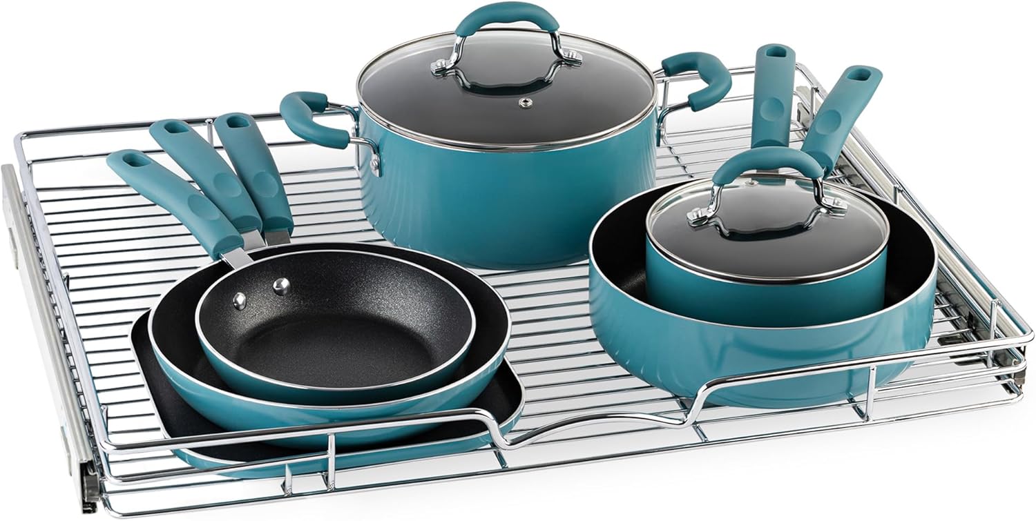 - HIGH QUALITY: Made of durable metal with chrome finish the pull out shelf for kitchen cabinet is simple and easy to install. Designed to fit any style of cabinetry and easy to clean.