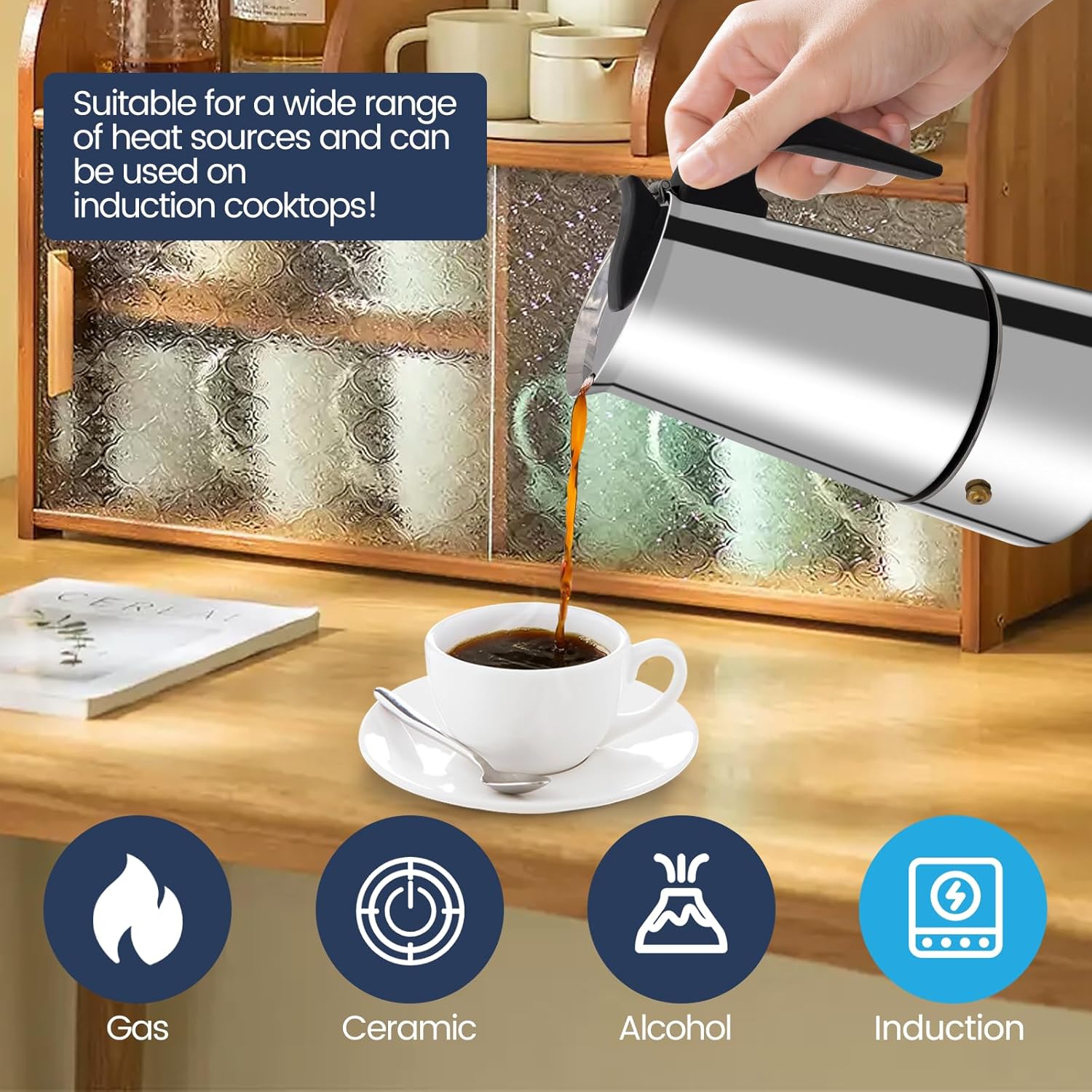 - Multiple Heating Methods Support: Our stainless steel moka pot supports multiple heating methods such as open fire, electric ceramic stove, induction cooker and so on, to meet your different needs of use