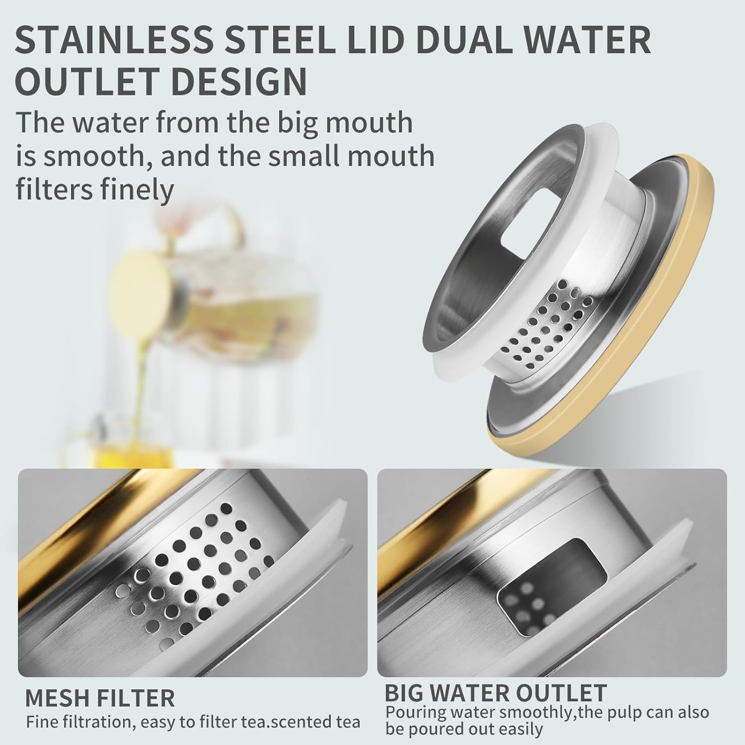 - Dual-Pour Stainless Steel Lid: The 304 stainless steel lid offers two pouring options—small holes for filtering tea leaves or pulp, and large holes for a smooth pour. Rust-resistant and built to last, it ensures versatility with every pour