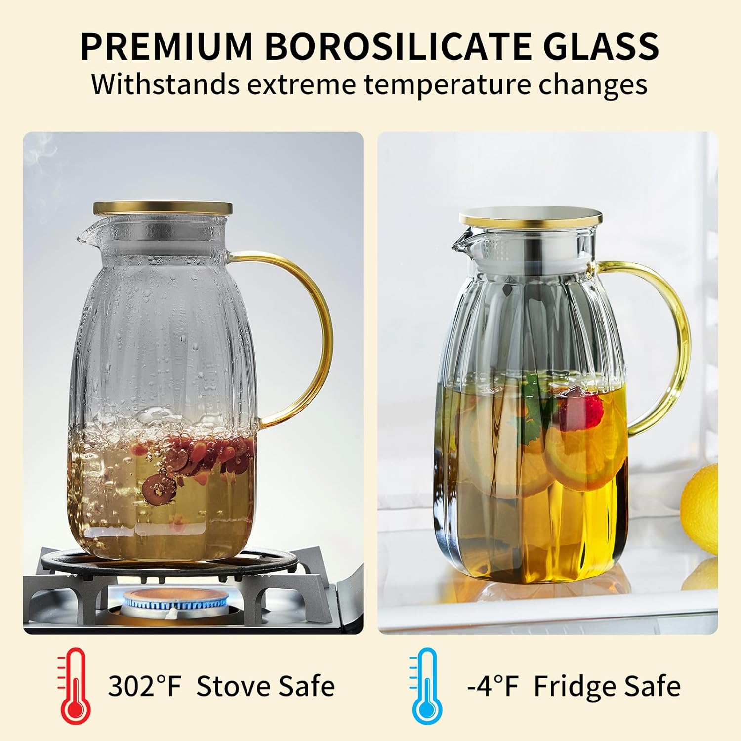 - Premium Borosilicate Glass: Made from durable, heat-resistant borosilicate glass, this 2000ml / 68OZ pitcher can safely hold both hot and cold beverages. Enjoy a purer taste with glass that outperforms plastic in flavor retention