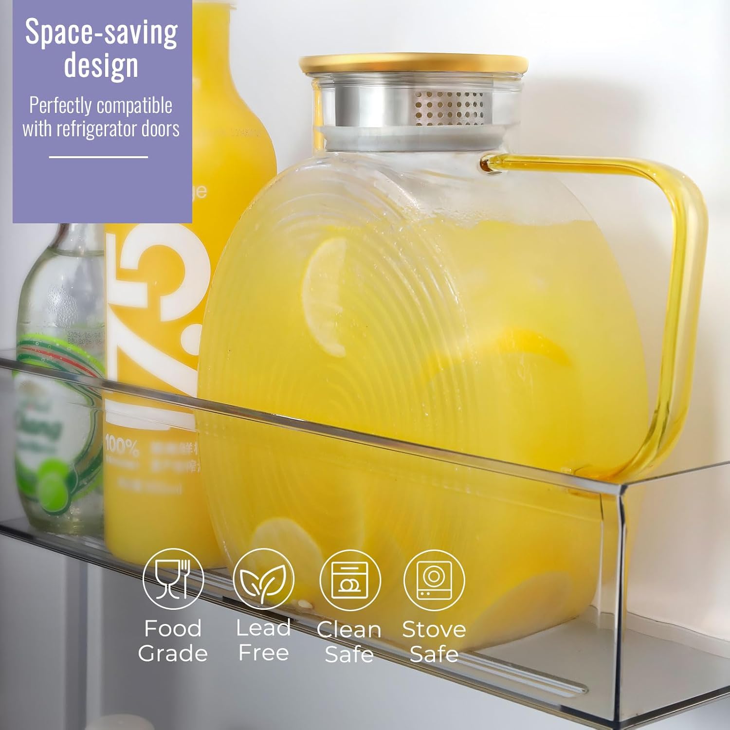 - Unique Space-Saving Design: WARMSIMPLE introduces a flat-bodied specifically designed glass pitcher with lid to fit snugly into your fridge side door, freeing up valuable space in your refrigerator. Say goodbye to bulky glass juice pitcher, taking over your fridge shelves!