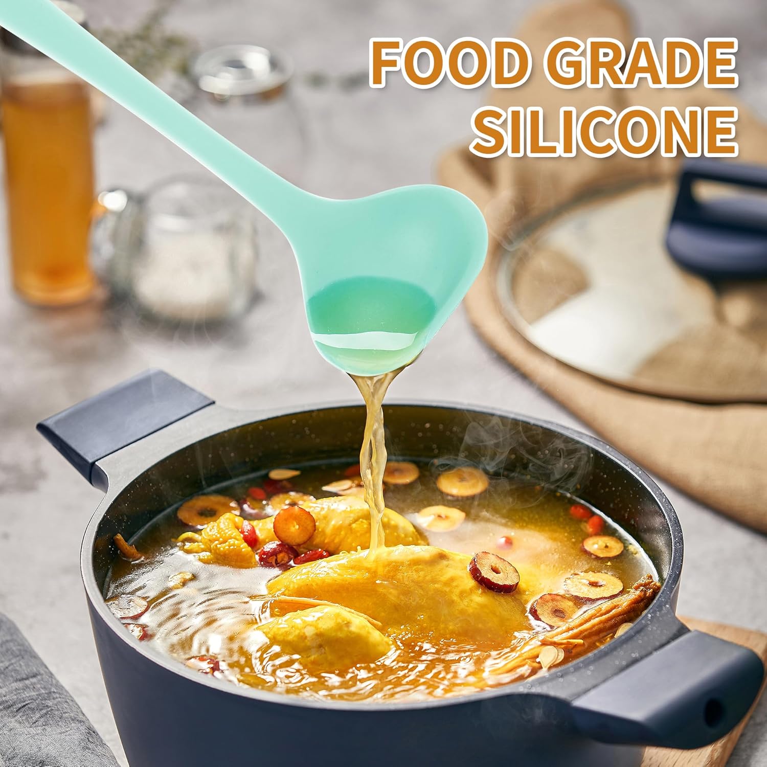- ESSENTIAL KITCHEN TOOLS: Include Slotted spoon, Solid spoon, Soup ladle, Slotted turner, Solid turner, Spaghetti spoon, Spatula, Tongs, Whisk, Silicone mat, Basting brush(ALL Silicone) + Plastic Egg separator and Measuring spoon. Meet all kinds of kitchen needs. From beginners to skilled cooks.