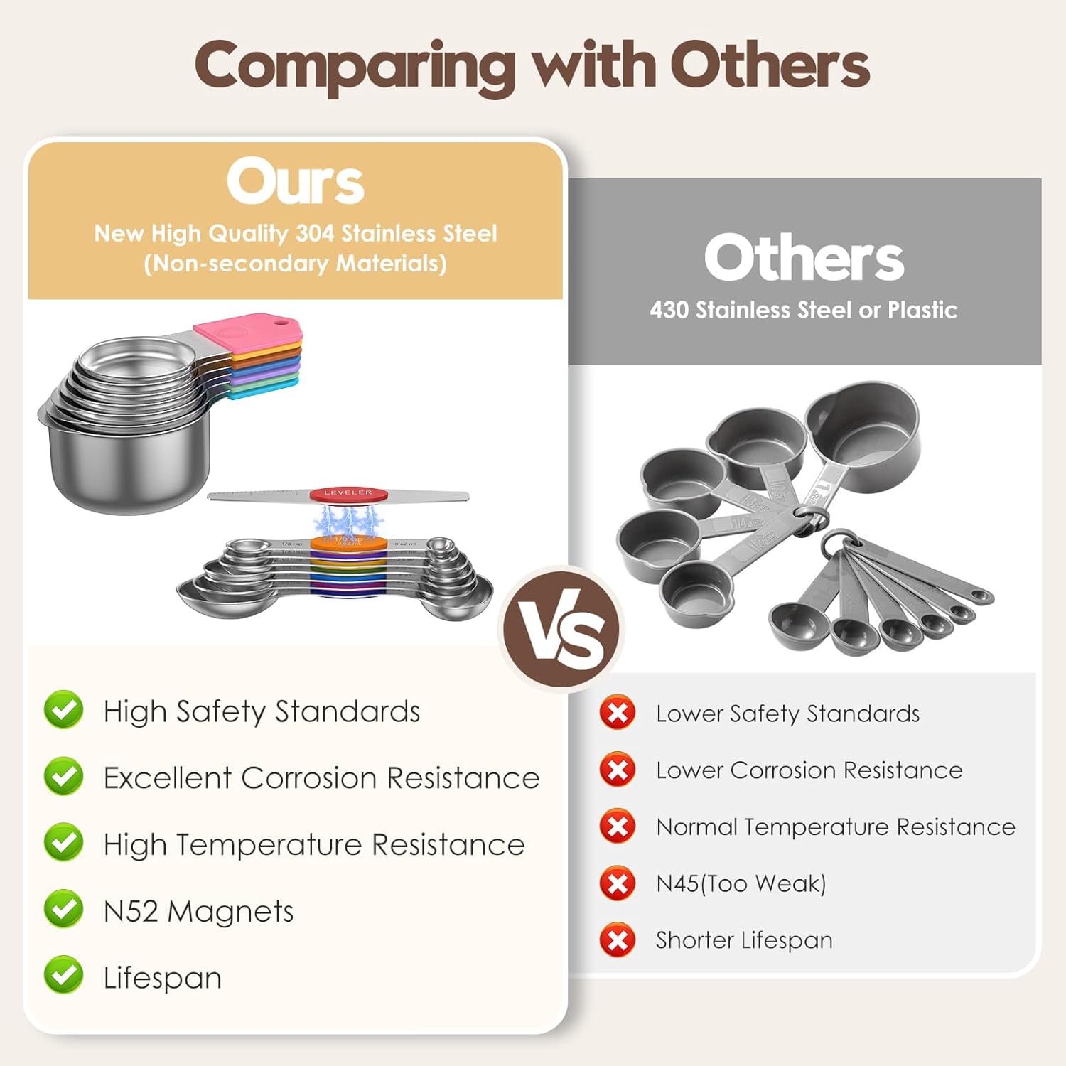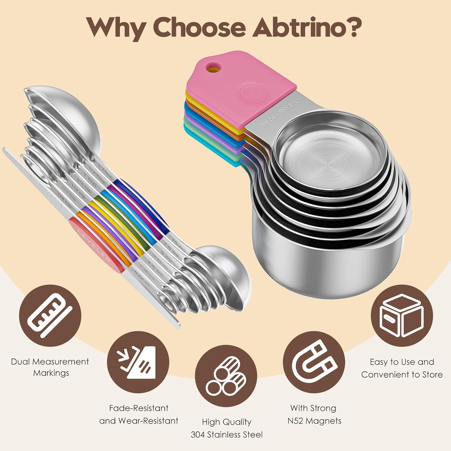 - Premium 304 Stainless Steel Construction for Durability: Abtrino Magnetic Stainless Steel measuring cups and spoons set is crafted from high-quality 304 stainless steel, ensuring long-lasting durability and rust resistance. Unlike plastic measuring tools, our heavy-duty measuring cups and spoons are built to withstand daily kitchen use, maintaining their shape and function over time.