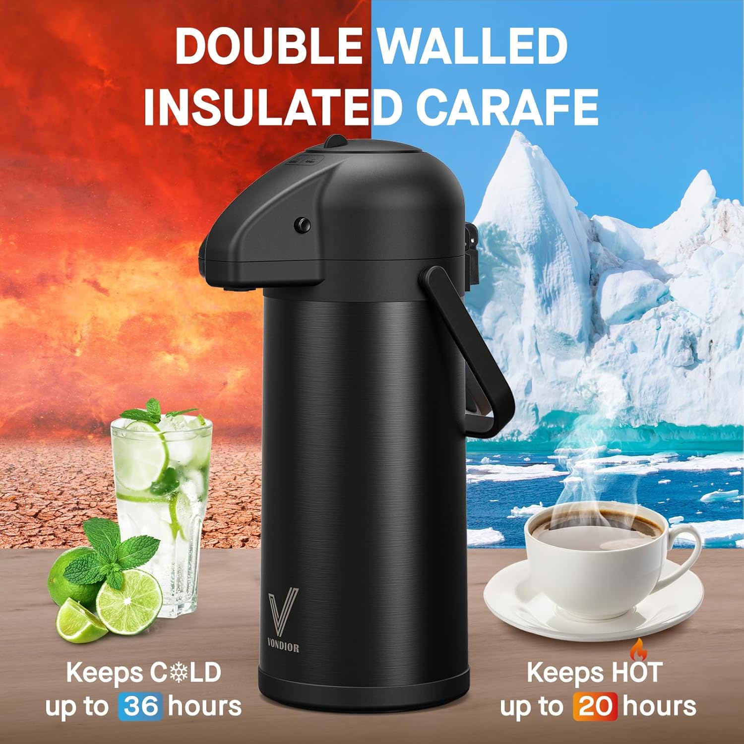- KEEP BEVERAGES HOT OR COLD FOR 20 HOURS: Vondior double-walled coffee carafe, which utilizes laboratory-tested vacuum insulation technology, ensures that hot beverages stay warm for up to 20 hours and cold beverages stay chilled for up to 24 hours. You can rely on this thermal coffee pot to maintain the optimal temperature of your drinks.