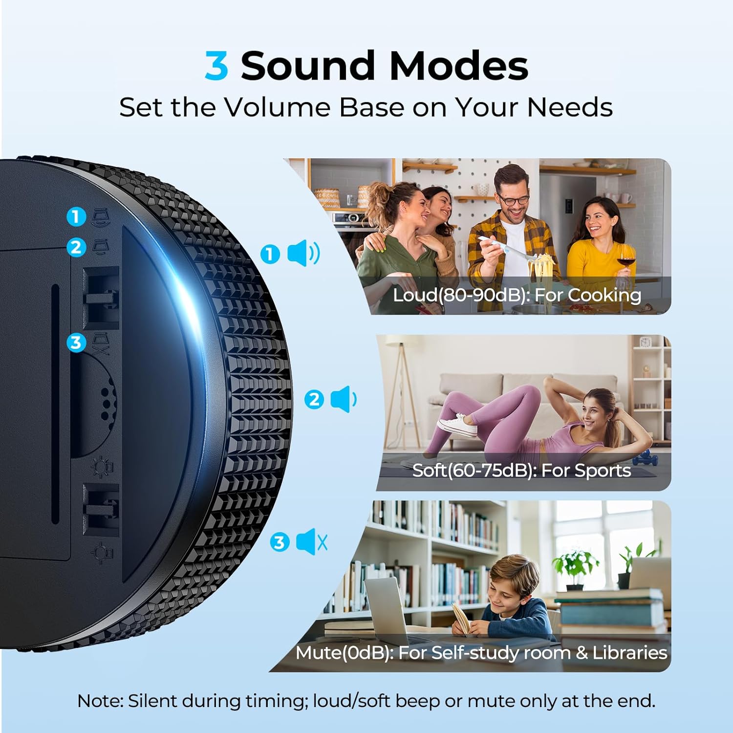 - 【Simple & User-Friendly Operation】: No more struggling with small buttons—just rotate the outer ring to set the time and press the button to start or stop. Choose from 3 volume levels: Mute (0 dB), Medium (60-75 dB), and High (80-90 dB) to suit your environment. The alarm can easily be heard across the room.