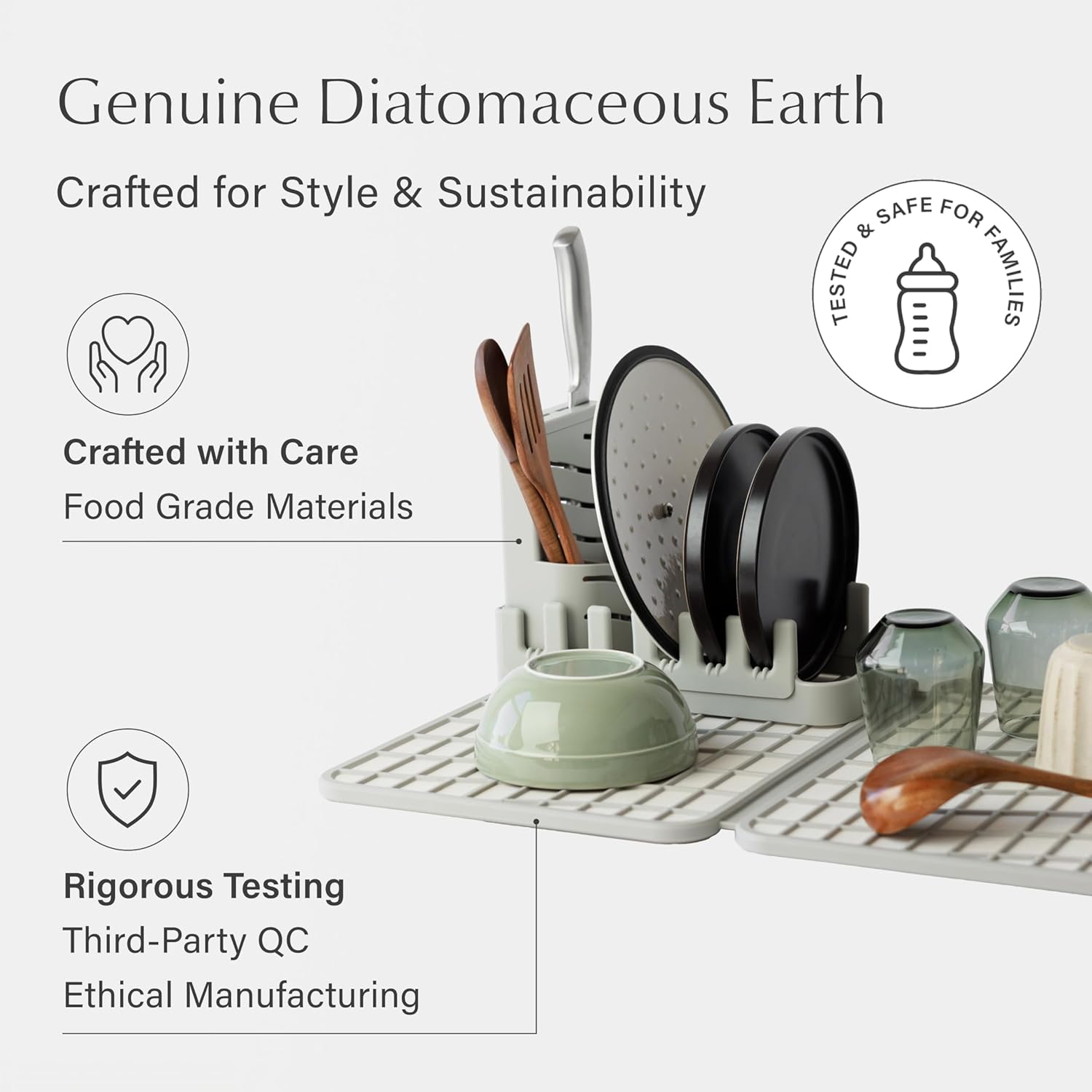- STONE DRYING MAT AND DISH DRYING RACK SET: A premium kitchen essential featuring a collapsible dish drying pad and drying rack. Maximize counter space with this modern dish rack, the perfect companion to the Dish Pad.