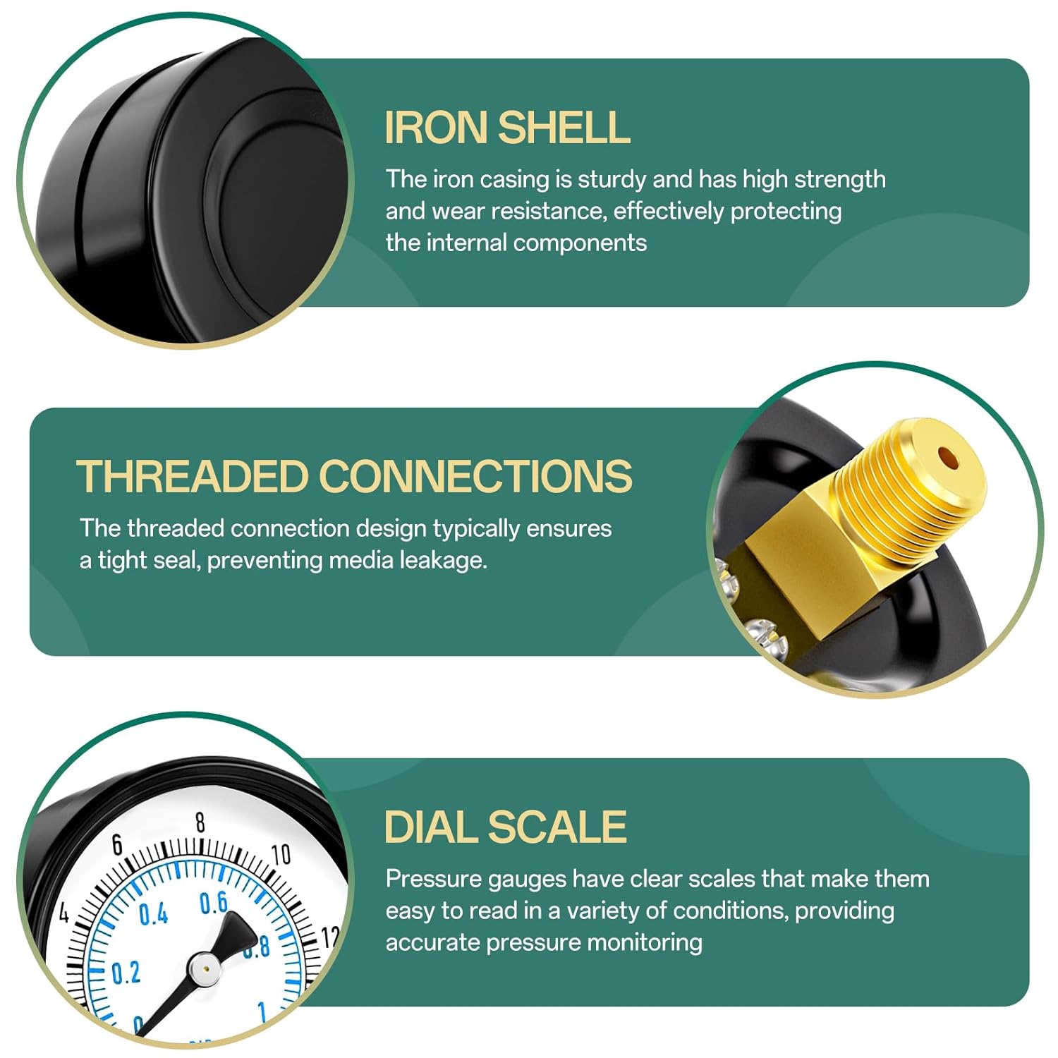 0-15PSI Well Pump Pressure Gauge 2" Dial Size, 1/4" NPT Back Mount, 3-2-3% Accuracy, for Tube, Water Pump, Gas, Liquid, Pressure Test