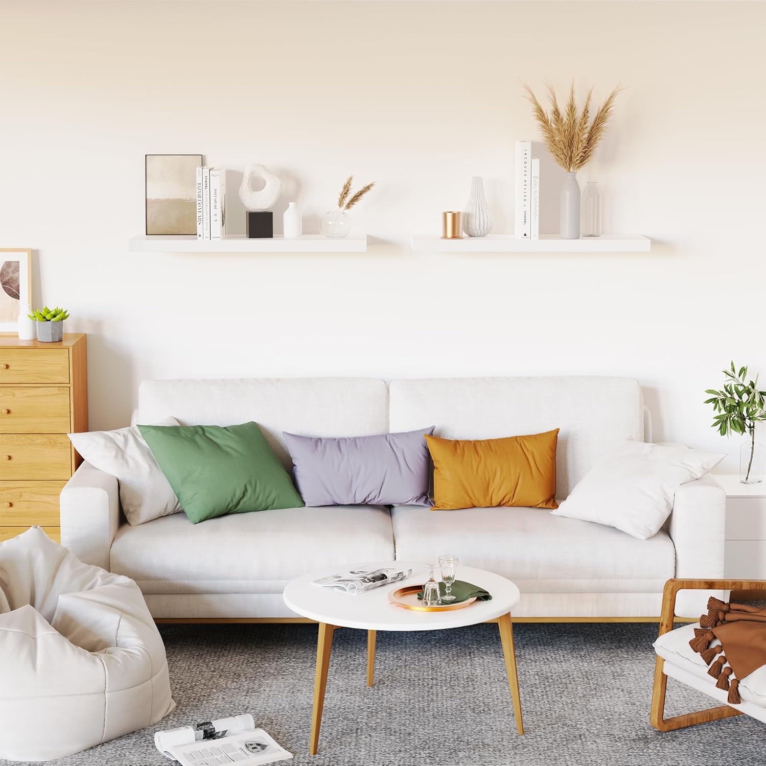 - ăVersatile & FunctionalăOur white floating shelves for wall can simplify our life which let everything will be in reach. Our wall shelf is a perfect space to display our family pictures, books, memorandums, charming antiques or artwork, spices or jars and fresh green plant. Our floating shelf wood not only give us extra storage but also improve the beauty of our home decor. Our white shelves can be perfectly integrated and decorated in the bathroom, kitchen, living room, bedroom and other place.