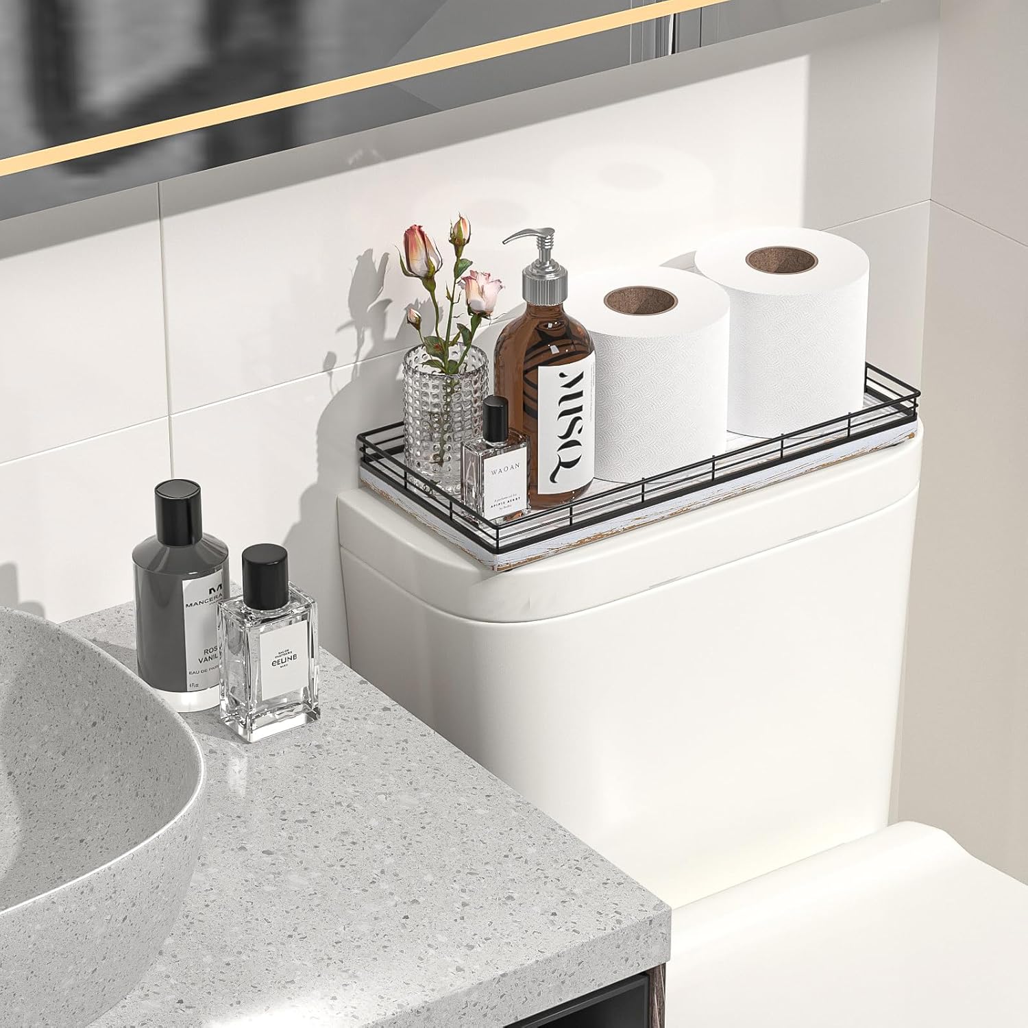 - Unique Charm: This 13 inches large wood rectangle toilet tank tray ensures durability and increased load-bearing capacity; Elevate your space with a unique appearance featuring a combination of iron mesh edges and farmhouse white wood board; Distinctive and captivating grain pattern adds an exquisite touch of elegance and sophistication; This bathroom toilet organizer tray blends modern minimalism with farmhouse charm seamlessly
