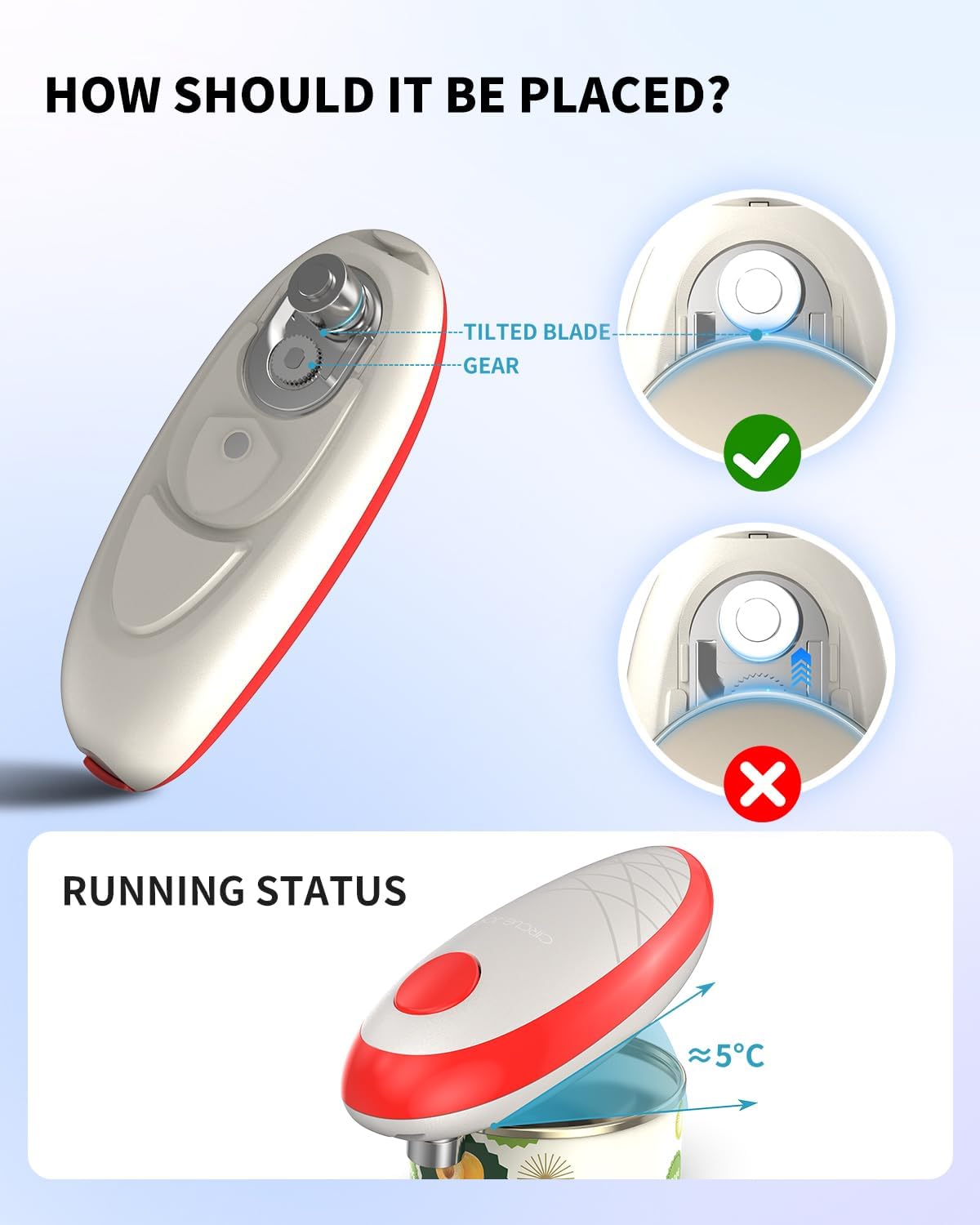 - One Touch Operation - Hands-free and mess-free. This electric can opener makes opening cans as easy as pushing a button. Simply press the button, the opener will slide along the rim of the cans for a clean cut. Press the button again and waitting for 2 seconds, and you're done opening cans. (Note: It requires manual stopping)