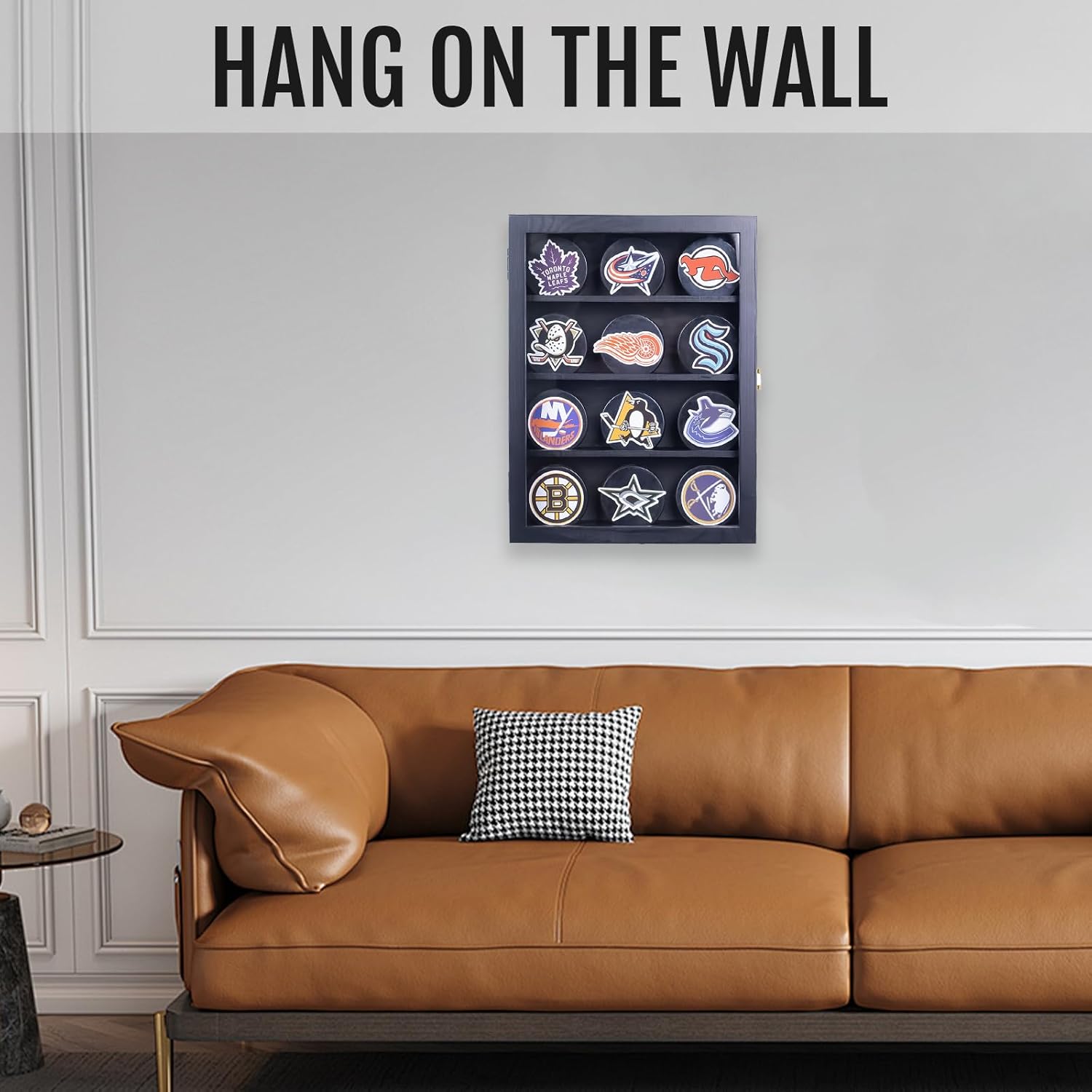 - 【HOCKEY PUCK DISPLAY CASE】: The hockey puck display case can display 12 hockey pucks.The size is 10.8*3*14.4inch.