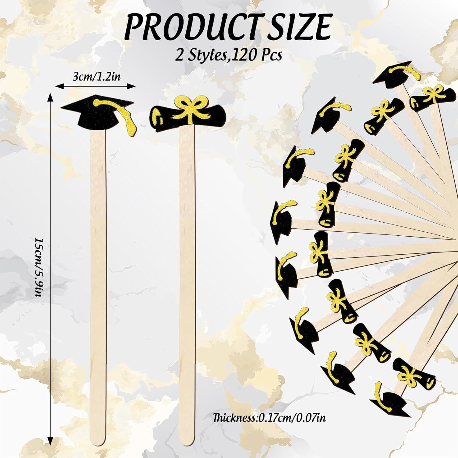 120Pcs Graduation Coffee Stirrers Grad Black Hat Diploma Disposable Stir Sticks Wooden Drink Stirrers for Home Office Bar Restaurant Party Supplies