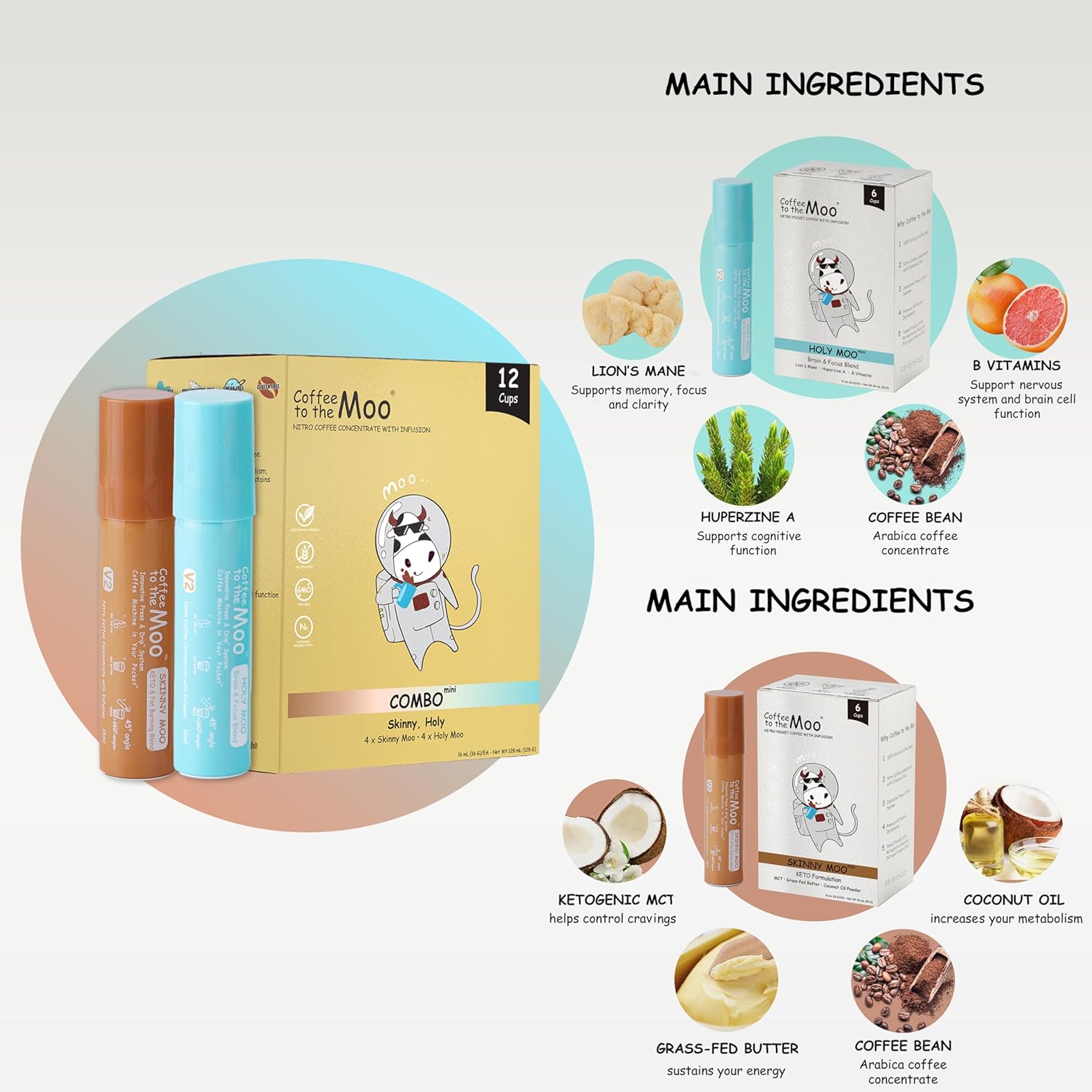 - 📦 Coffee Concentrate Combo Pack - Combo Pack offers 4x Skinny Moo (KETO) and 4x Holy Moo (Mushroom Coffee) blends, catering to various lifestyles and wellness goals like boosting brain functions. Complete Cold Brew Kit.