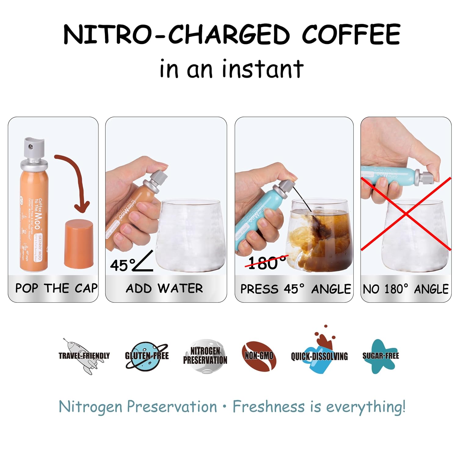 - ♻️ Nitro Cold Brew Pocket Coffee - Elevate your instant coffee, hot or iced coffee experience with Coffee to the Moo's 8-pack, nitro-infused coffee concentrate canisters with Top Press & Drip design. Recyclable Aluminum Coffee Canisters.