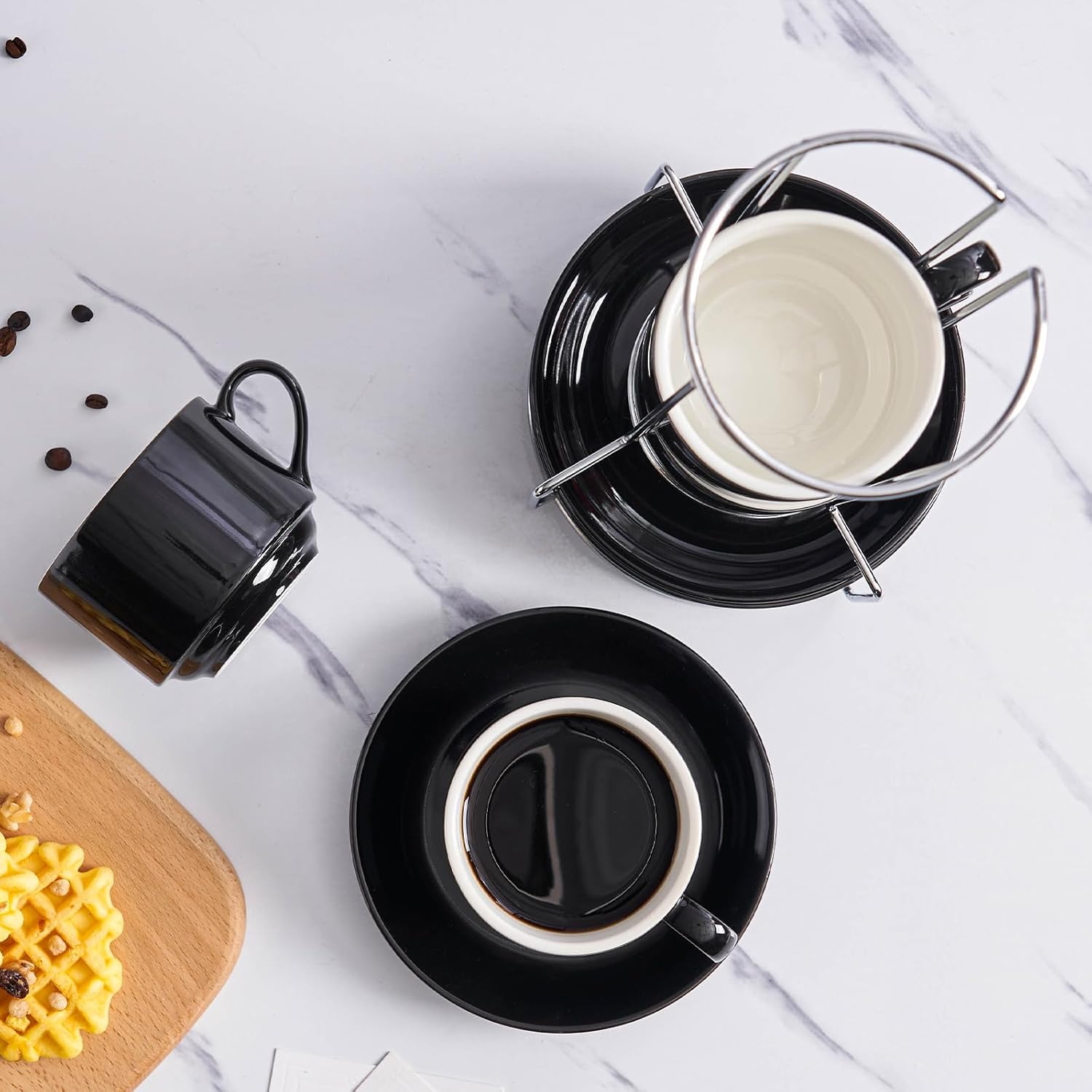 8 Ounce Porcelain Cappuccino Cups with Saucers and Silver Stand, Black Cups Set of 4