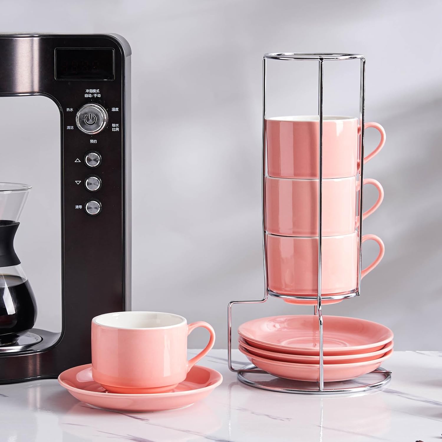 8 Ounce Porcelain Cappuccino Cups with Saucers and Silver Stand, Pink Cups Set of 4