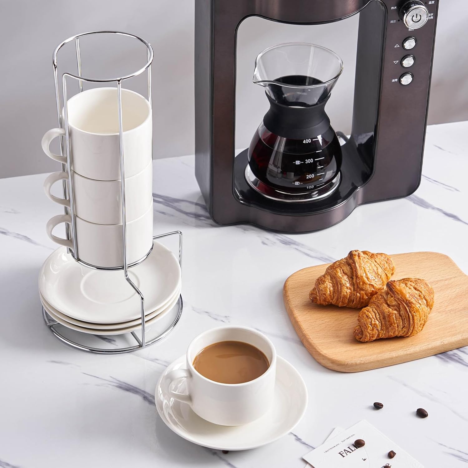 - The cups and saucers can be stacked neatly on the metal stand for easy organization, keeping your coffee corner clean and tidy. Say goodbye to clutter and embrace the simplicity of an organized life.