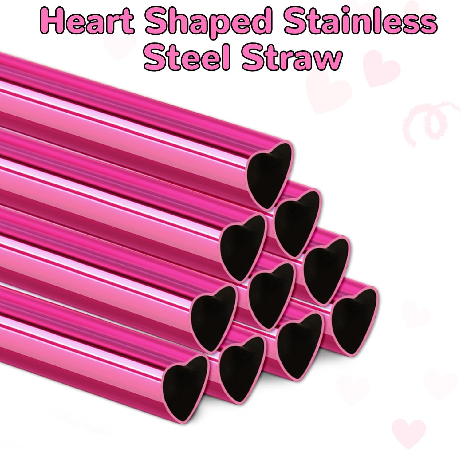 NiHome 10-Pack Heart-Shaped Stainless Steel Drinking Straws with 2 Cleaning Brushes, 12" Long Reusable Straws for Stanley Tumbler 30oz 40oz, Dishwasher Safe, Safe Edges for Kids (Pearl Hot Pink)