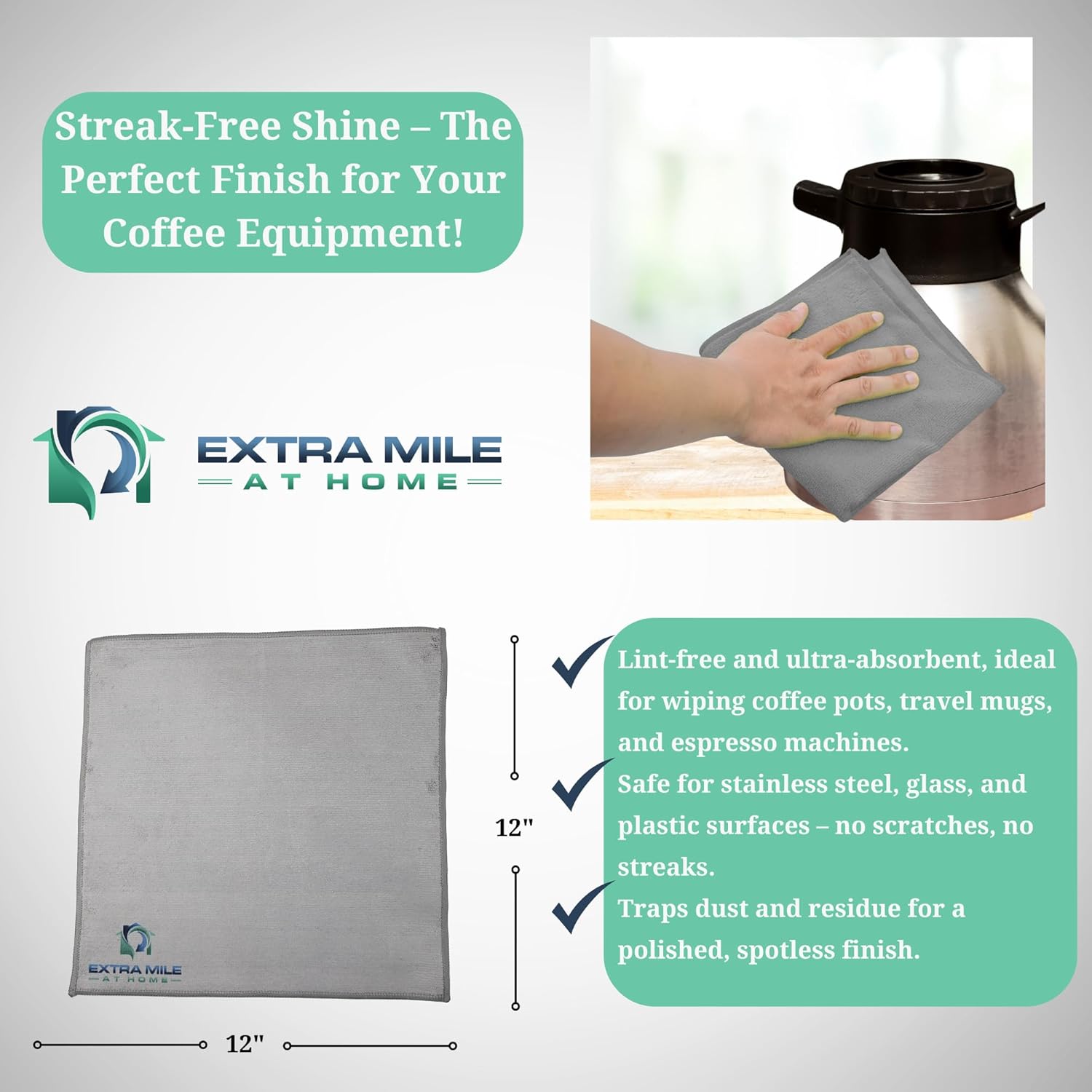 - Premium Microfiber Cloth for a Streak-Free Finish – A clean coffee maker is only part of the solution; surfaces and accessories need attention too. The included 12”x12” microfiber cloth is ultra-soft, highly absorbent, and lint-free, making it perfect for polishing carafes, wiping down coffee machines, and cleaning travel mugs without scratching. It attracts and holds dust, absorbs spills quickly, and removes streaks and residue, ensuring every part of your coffee setup stays spotless.