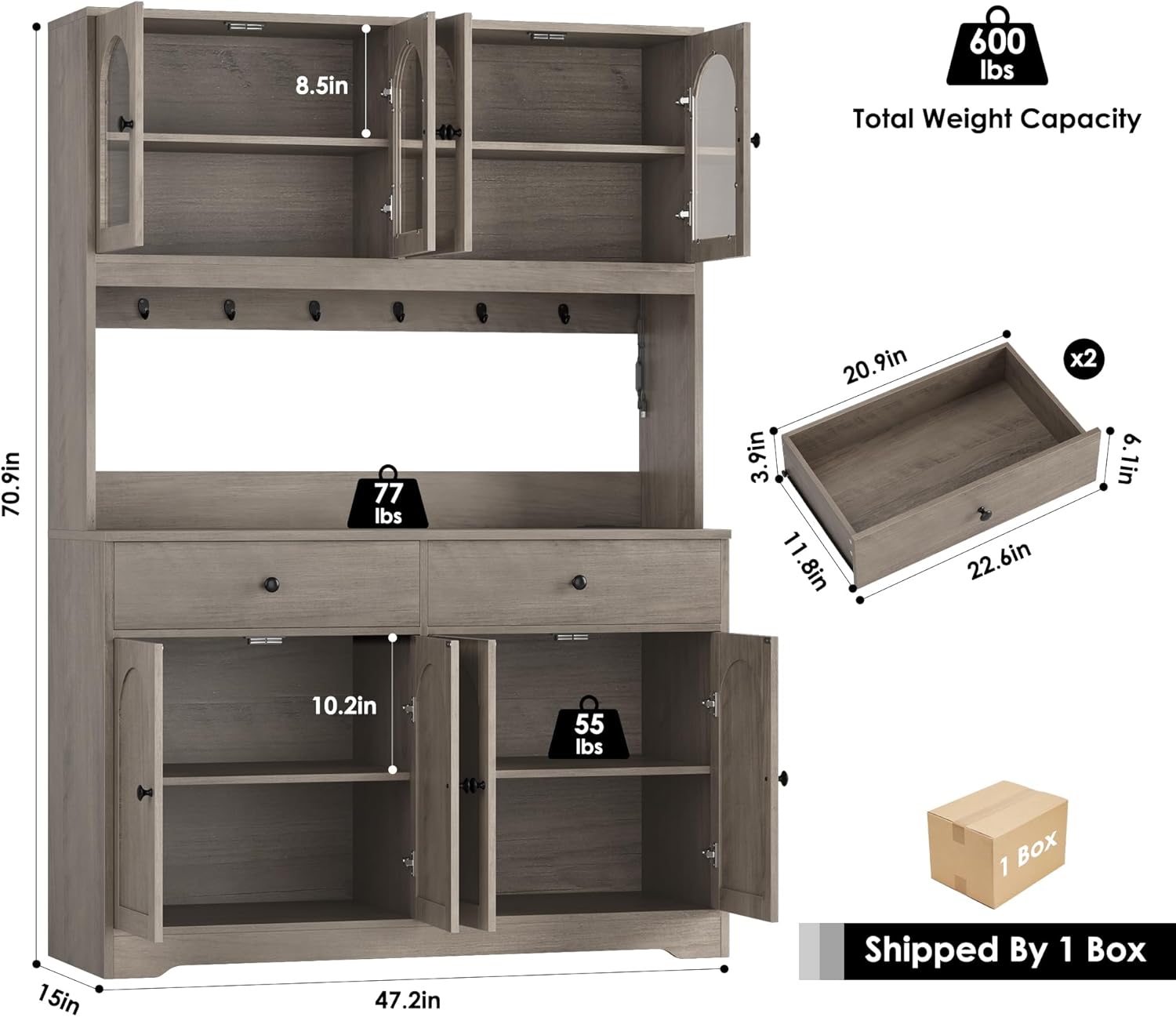 - AMPLE STORAGE SPACE: Our large kitchen cabinet combines a buffet and an upper hutch cabinet, offering 8 roomy compartments to meet all your needs. The generous countertop provides an ideal surface for placing a coffee machine or serving drinks and snacks to guests, while the 6 sturdy hooks are perfect for hanging bottle openers, mugs or other kitchen accessories, keeping them within easy reach. Plus, 2 large drawers are thoughtfully designed to keep cutlery and condiments neatly organized