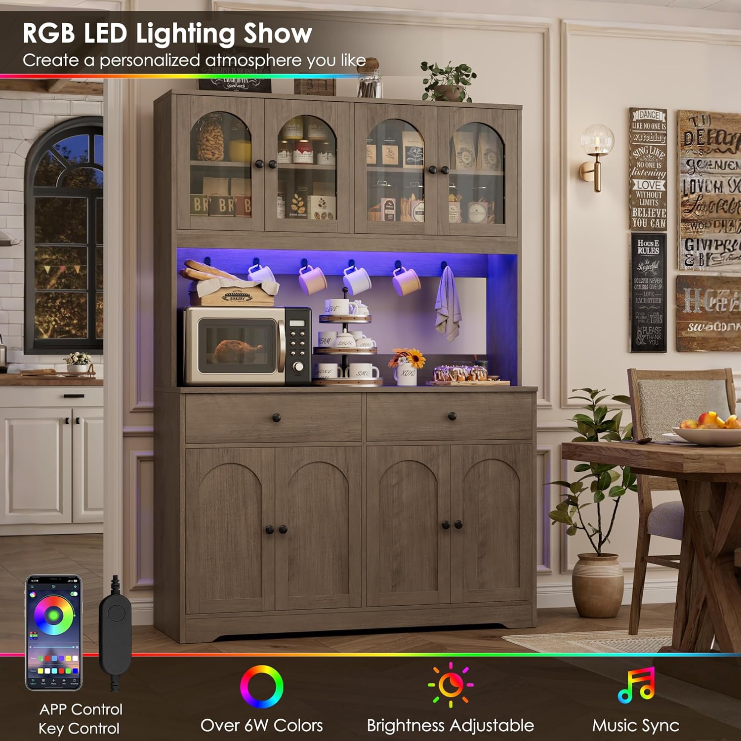 - MULTI-FUNCTION RGB LED CABINET: This kitchen pantry cabinet is equipped with a smart RGB LED light strip, controllable via an intuitive app or a convenient switch. Featuring over 60,000 vibrant colors, it allows you to customize the ambiance to suit your mood with adjustable brightness and color settings. For an enhanced experience, sync the lights to the beat of your favorite music, creating a dynamic and immersive party atmosphere
