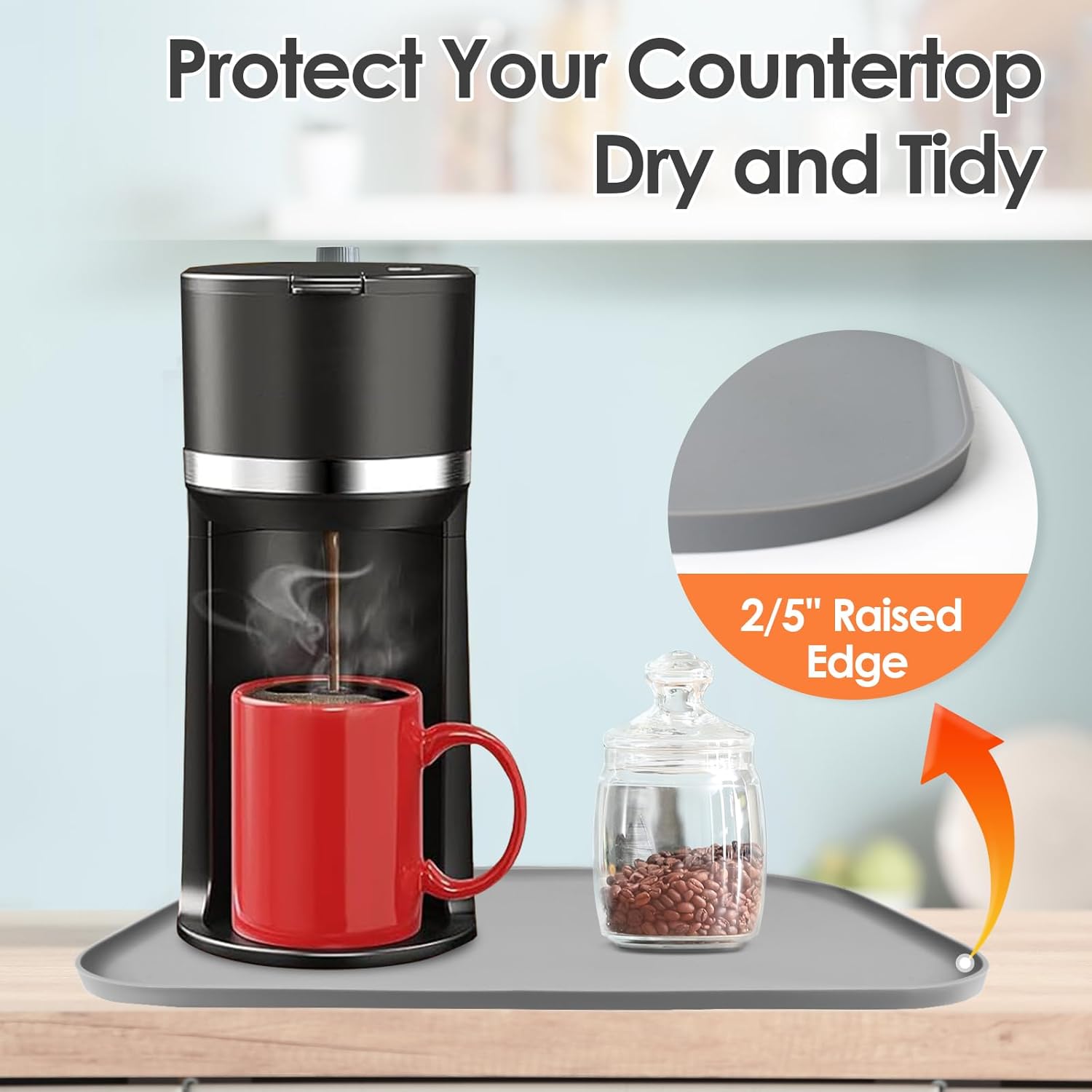 - 100% Water Does Not Flow Out: The coffee maker mat is built with 2/5" raised edge, like a tray and it can contain any liquid spills from the coffee maker. The premium material not only protect your countertop from scratches, especially protect the wood countertop, but also keep your your countertop tidy, clean.