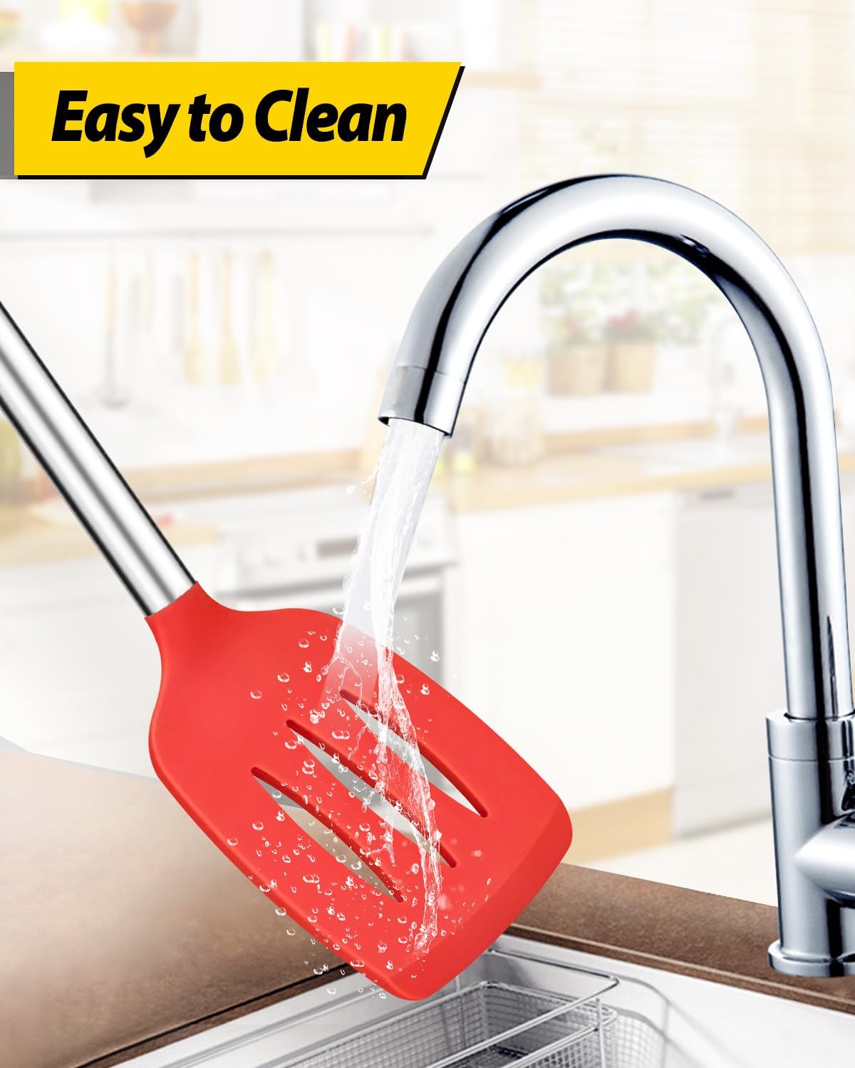 Pack of 4 Silicone Cooking Utensils Set, Non Stick Large Solid Spatulas, Heat Resistant Slotted Spoons, Ideal BPA Free Kitchen Turners for Frying, Mixing,Serving,Draining,Turning,Stirring (RED)