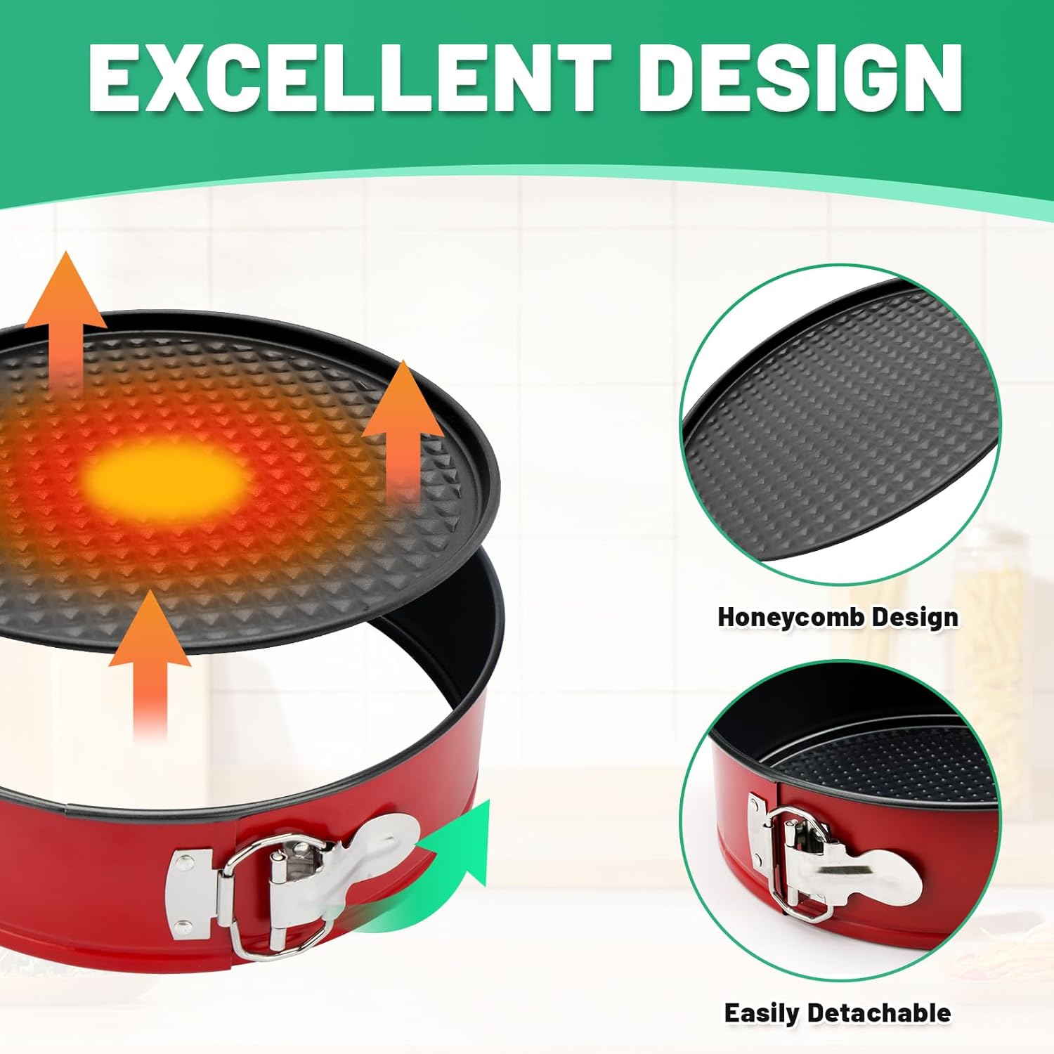 - Premium Springform Pan: This non-stick stainless-steel cheesecake pan is equipped with a heavy-gauge steel core that distributes heat evenly. Designed with interlocking layers for a perfect release, allowing you to make professional looking cheesecakes, coffee cakes, tarts and more. Once the spring hinge is closed, the honeycomb textured base ensures even heat flow, baking the layers of the cake consistently.