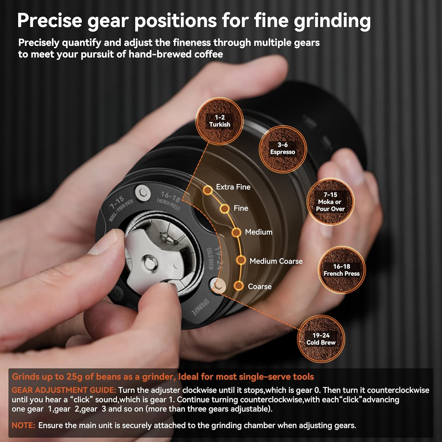 - [As a Grinder : Precision, Flexibility & Portability] Featuring high - precision SUS420 stainless - steel conical burr and dual - bearing stabilization, it ensures uniform grinding with minimal heat and noise. The 1600mAh rechargeable battery supports 25 grinding sessions per charge (level 10), ideal for outdoor use. 24+ adjustable settings cater to all brew styles, from fine espresso to coarse cold brew.