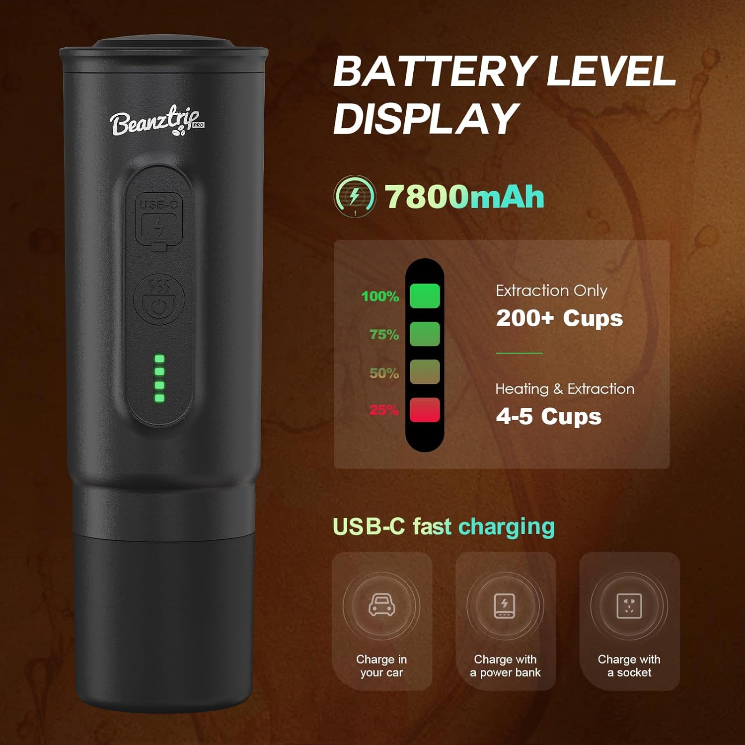- ăExtended Battery Lifeă200+ cups per charge - engineered for outdoor! The high-capacity battery heats water for 200+ cups (pre-heated) or 4-5 full brew cycles (from cold to hot). BeanzTrip travel coffee maker is suatible for multi-day trips without power sources.