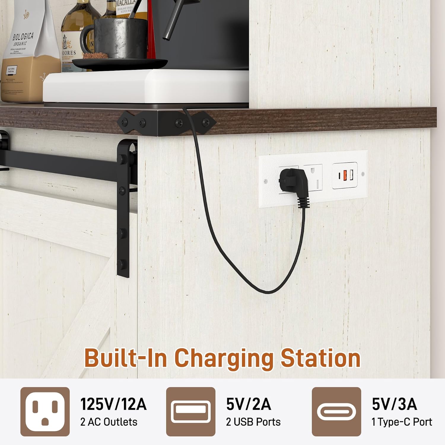 Farmhouse Coffee Bar Cabinet with Charging Station & Sliding Barn Doors - 63" W x 71" H Large Wine Rack, Built-in Liquor Dispenser, Glass/Mug Holders for Kitchen, Living Room, Hallway