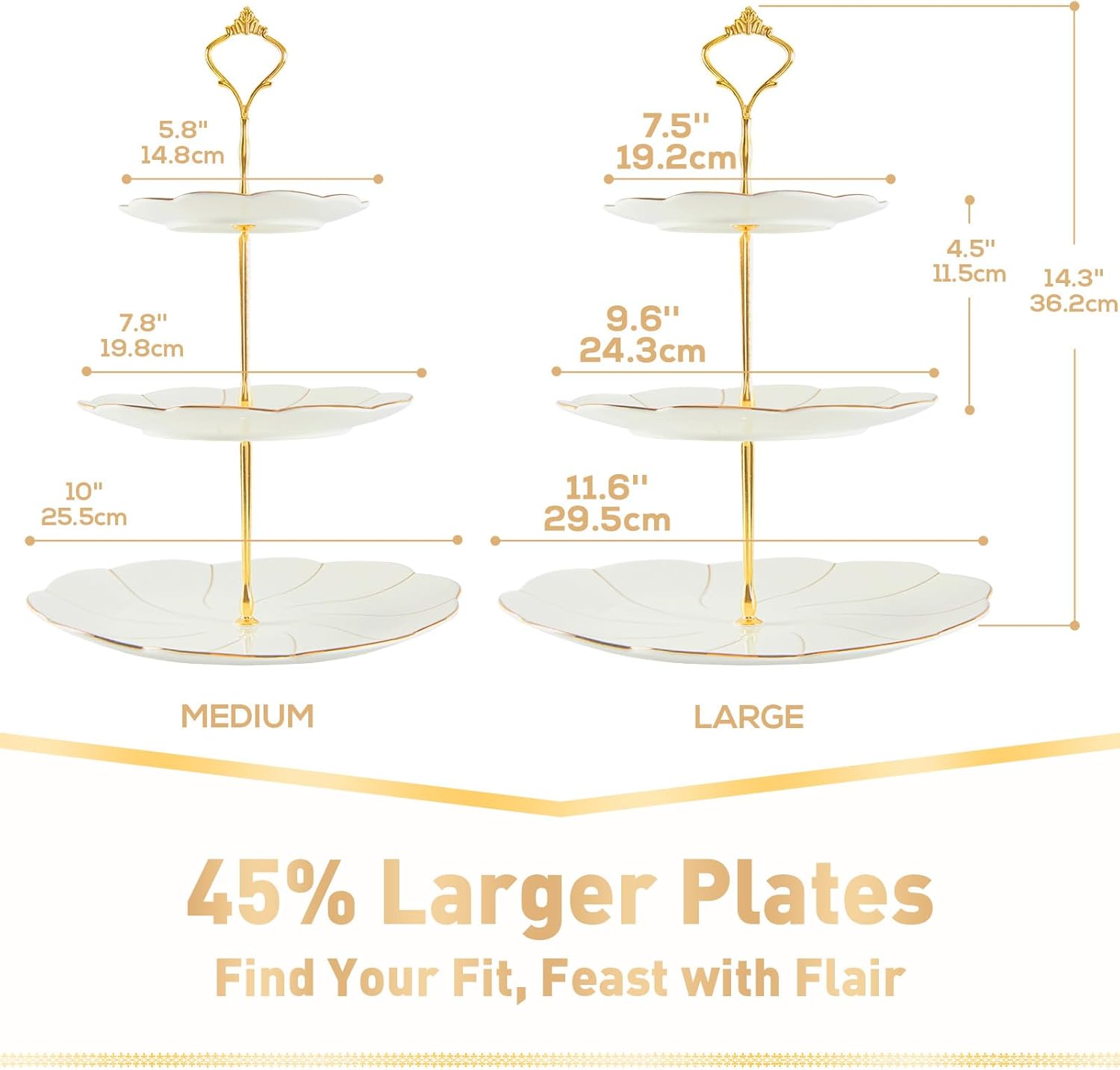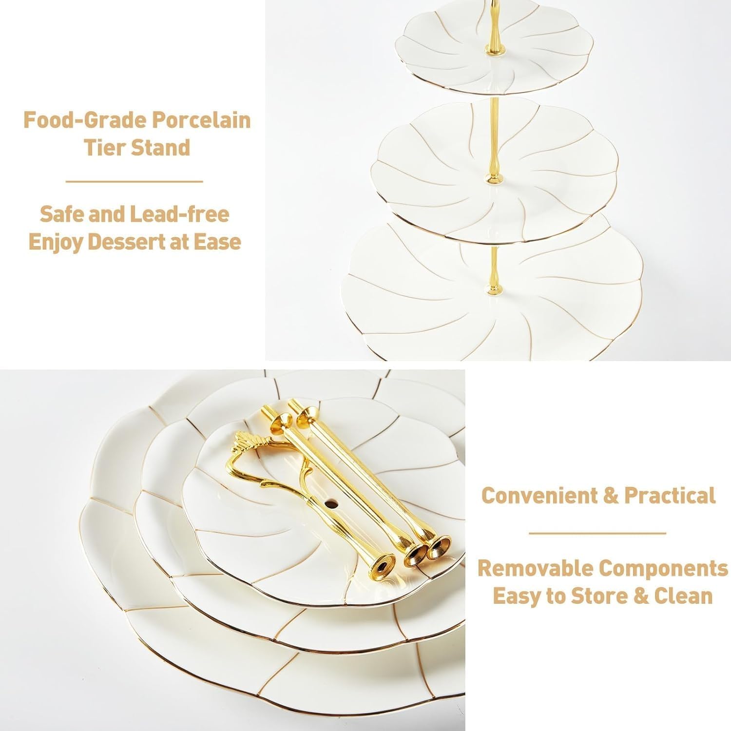 - 【Food-Grade Porcelain Tier Stand, Let You Enjoy Dessert at Ease】Crafted from high-quality porcelain clay, our tiered stand ensures a safe and lead-free dining experience. Enhanced with German Heraeus gold glaze, the exquisite design complements your daily rituals. The 3-tier structure accommodates cakes, sandwiches, and fruits, enhancing the premium aesthetic of your tableware. Enjoy delightful moments with family and friends, surrounded by this tastefully crafted piece.