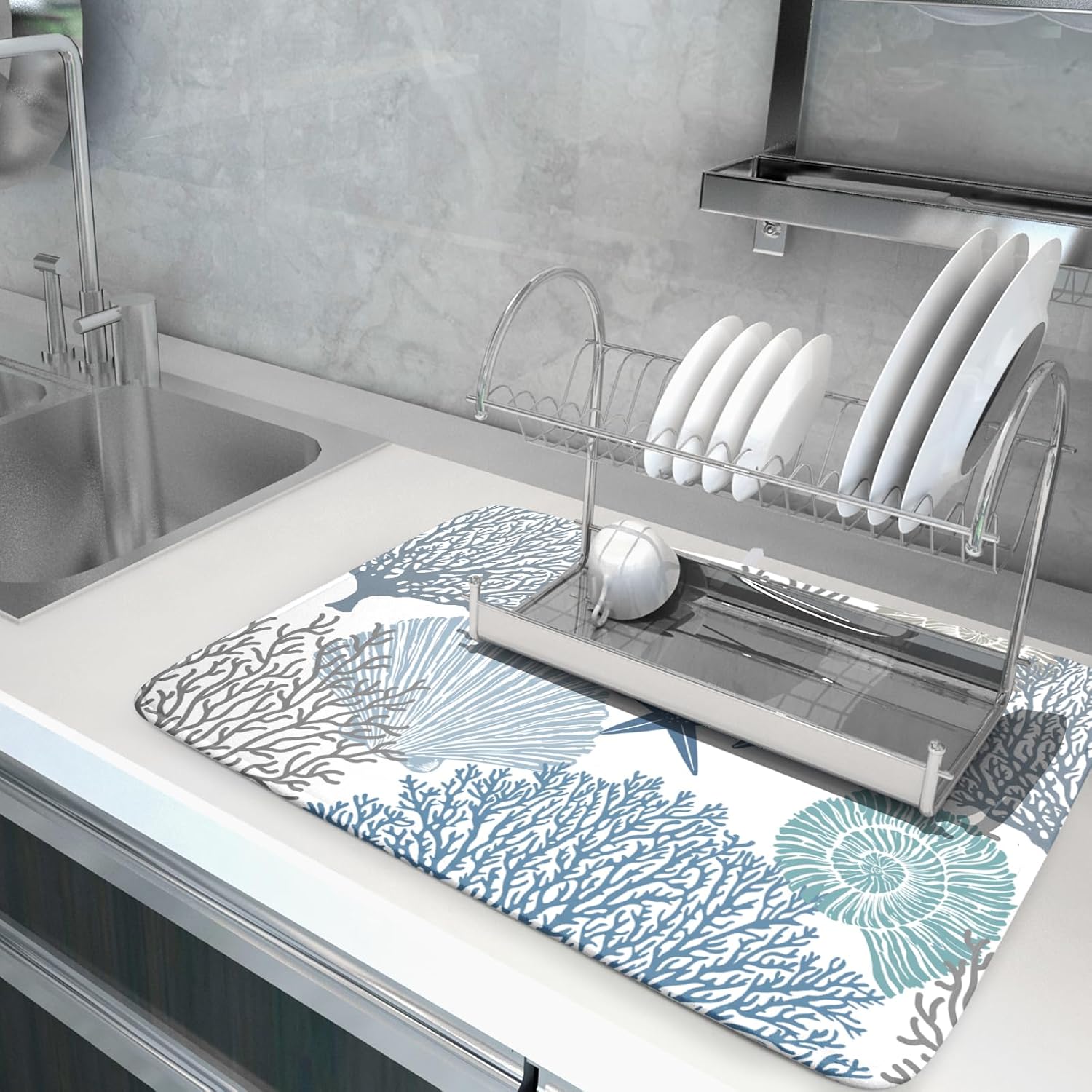 Blue Coral Dish Drying Mat 18x24 Inch Absorbent Reversible Summer Beach Drying Mat Nautical Coastal Starfish Dish Drying Rack Mat Ocean Themed Dish Drainer Mat for Kitchen Counter Coffee Bar