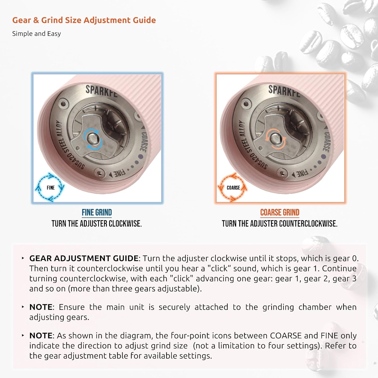 - [Stainless Steel Conical Burr, Precision Dual Bearings, Adjustable Grind Settings] The stainless steel five-star conical burr, paired with precision dual bearings, ensures consistent and even grinding, providing you with a personalized and professional coffee experience. With 24+ gears of adjustable grind settings, you can easily switch from fine to coarse, making it perfect for espresso, moka, pour-over, French press, cold brew, and more. Enjoy your perfect cup of coffee anytime, anywhere.