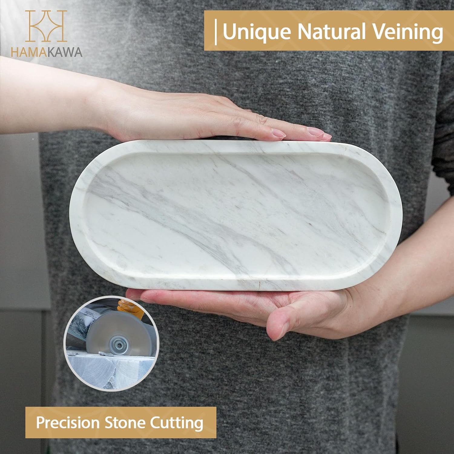 Bathroom Vanity Tray, Large Natural Marble Oval Sink Tray 10 Inch, Jazz White Limestone Dresser Tray for Soap Dispenser Modern Countertop Organizer for Kitchen Countertops, Home Decor