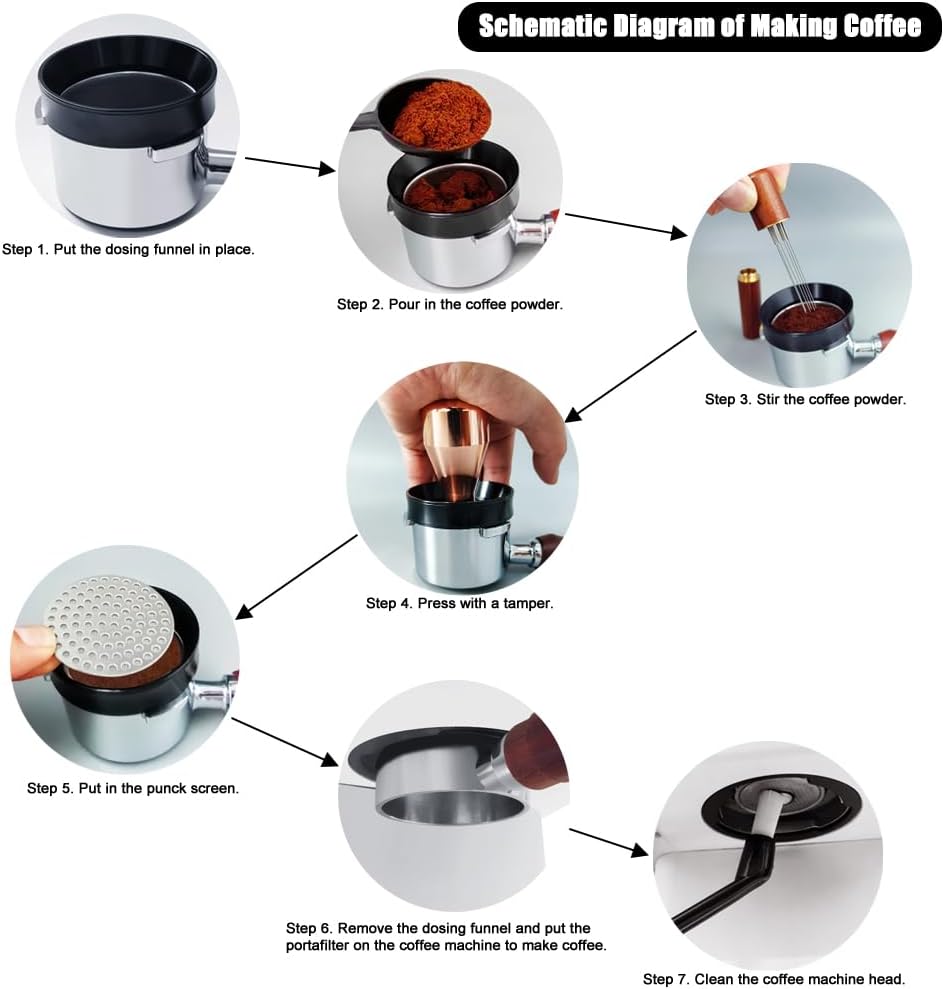 - The 51mm dosing funnel is made of aluminum with 6 magnets, which has a strong adsorption force. The advantages of this tool are: you don’t have to remove the dosing funnel, put the tamper into the coffee basket and press it, which can better prevent powder from falling.
