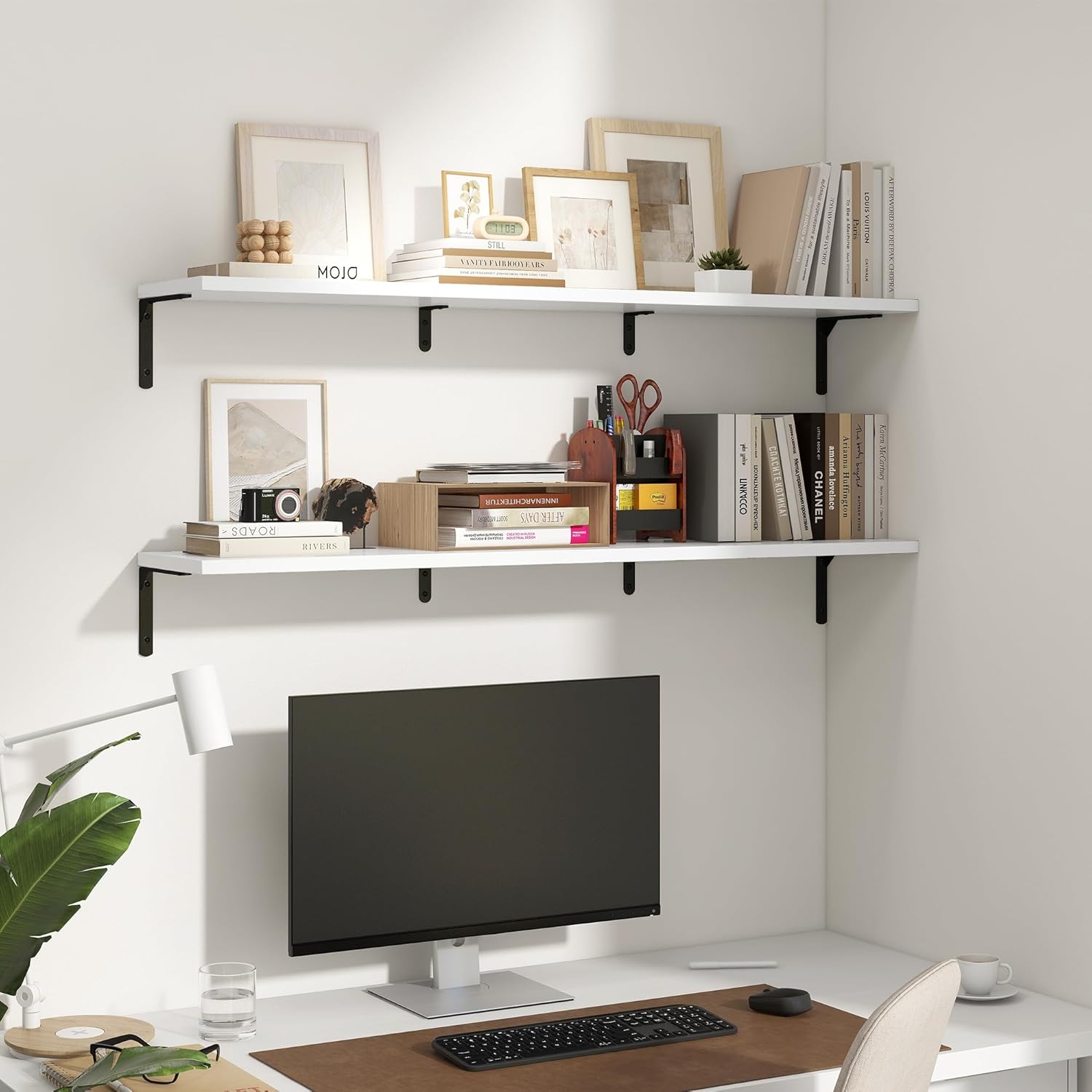 - ăStylish & Space-Saving Wall ShelvesăEnhance your home decor while saving space with our modern wall-mounted shelves. These 48 inch floating shelves feature a sleek, minimalist look with black L-shaped metal brackets and smooth MDF boardsâperfect for adding extra storage or displaying small plants, photo frames, and home accessories in any room.