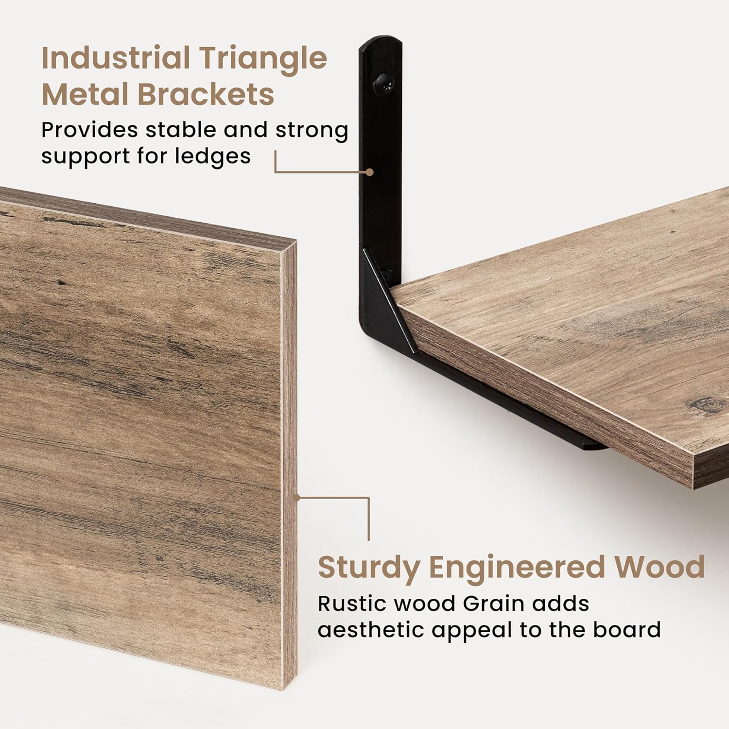 - ăStrong & Durable Construction for Long-Lasting UseăEach shelf is made from premium high-density MDF with a smooth, durable surface resistant to warping and cracking. Paired with heavy-duty black L-shaped steel brackets, these shelves provide excellent strength and stability. Properly installed, each shelf supports up to 50 lbs, perfect for books, kitchen items, and decor. Built to endure daily use in kitchens, living rooms, offices, or bathrooms, combining durability with timeless style.