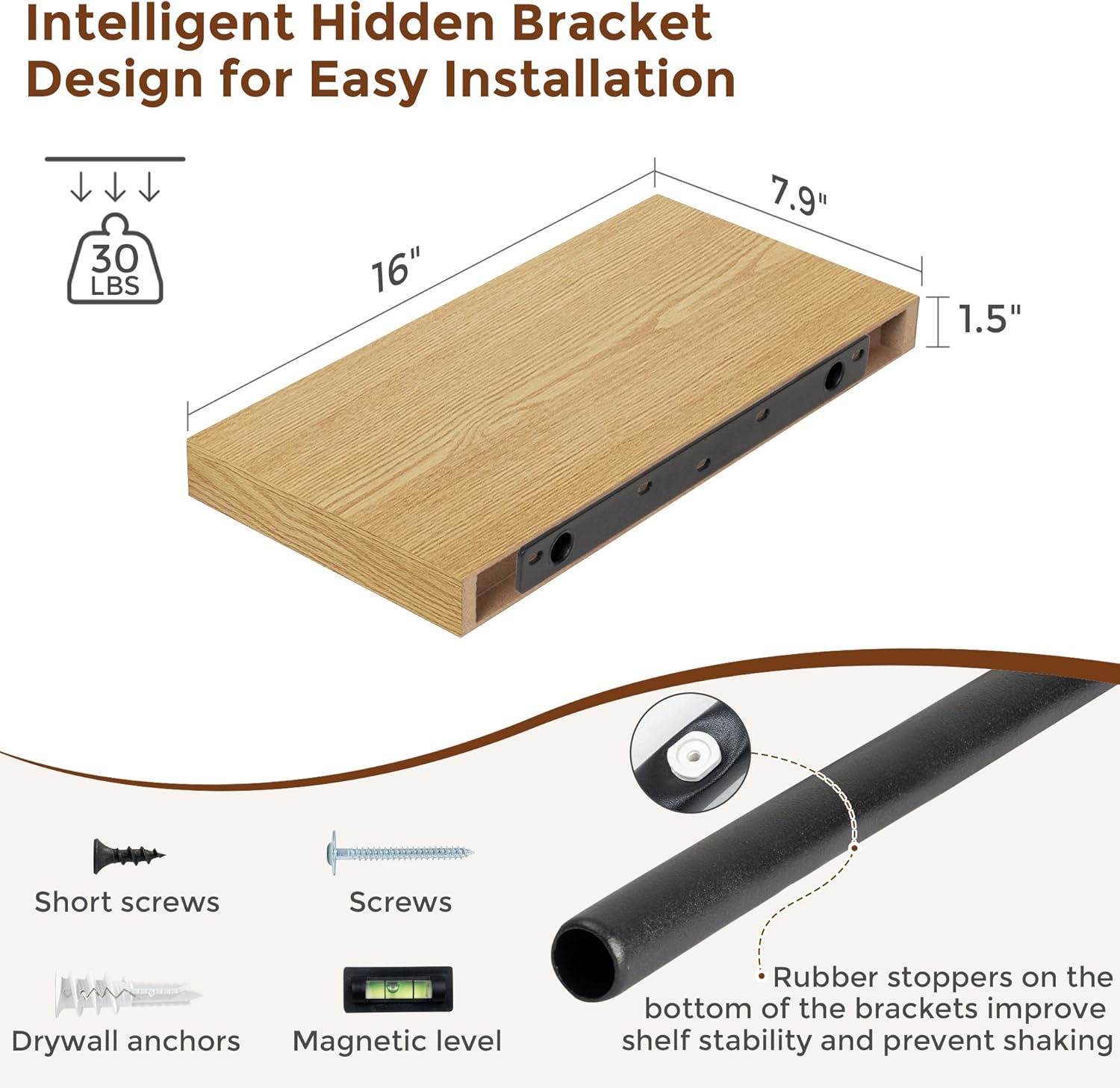 - ăEasy To InstallăThis oak floating shelves not only come with stainless-steel galvanized invisible brackets, but also equipped a fixing screw at the bottom to fix the shelf on the support rod, which solves the problem of sliding and is not easy to damage, and can be used for a long time. Instructions, magnetic level, drywall anchors, and screws included.