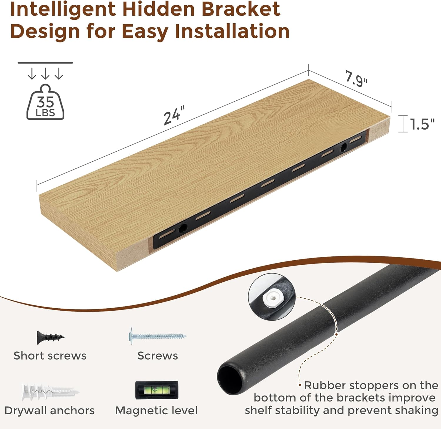 Heimlove 24 Inch Floating Shelves for Wall Oak Shelves Set of 2,Wall Mounted Rustic Wood 8 Inch Deep Floating Shelf with Invisible Brackets for Bedroom Kitchen Living Room