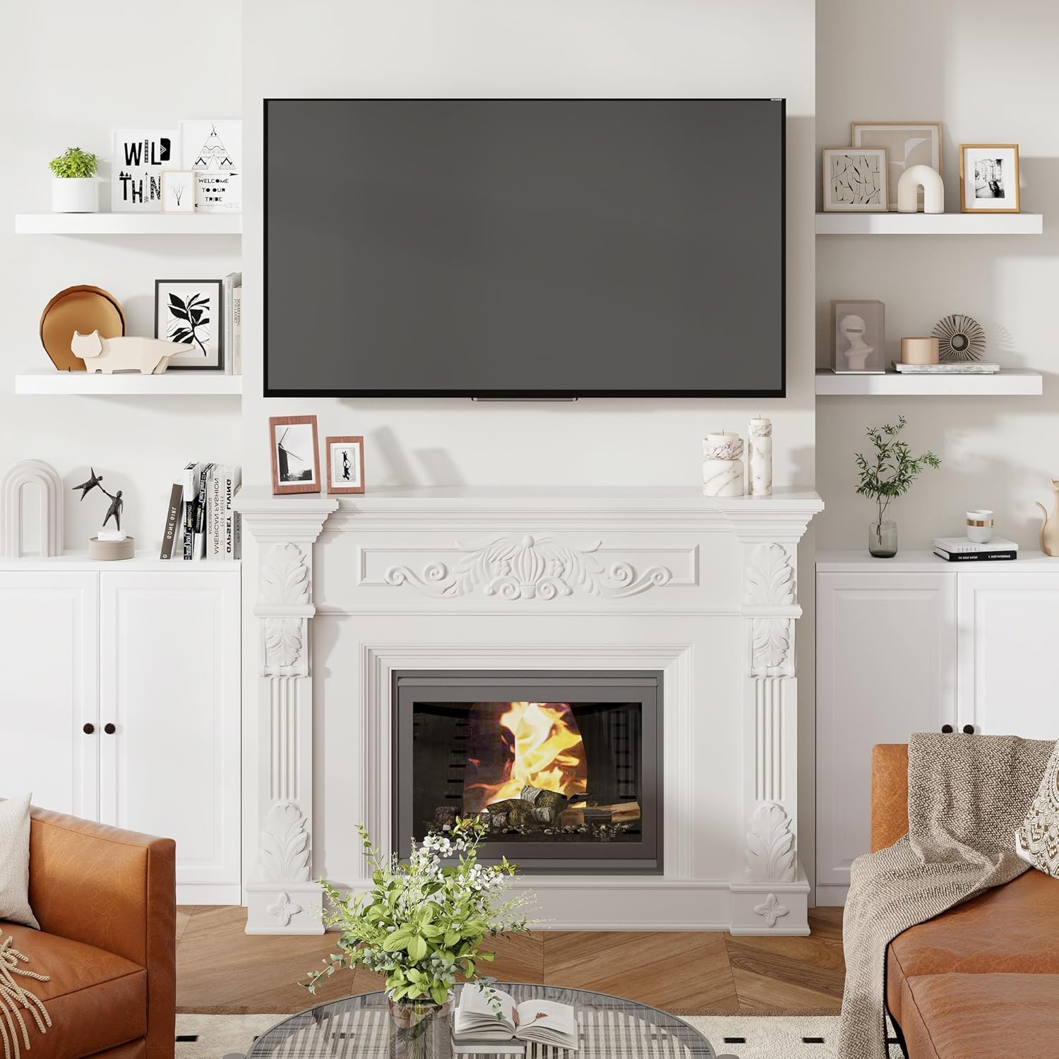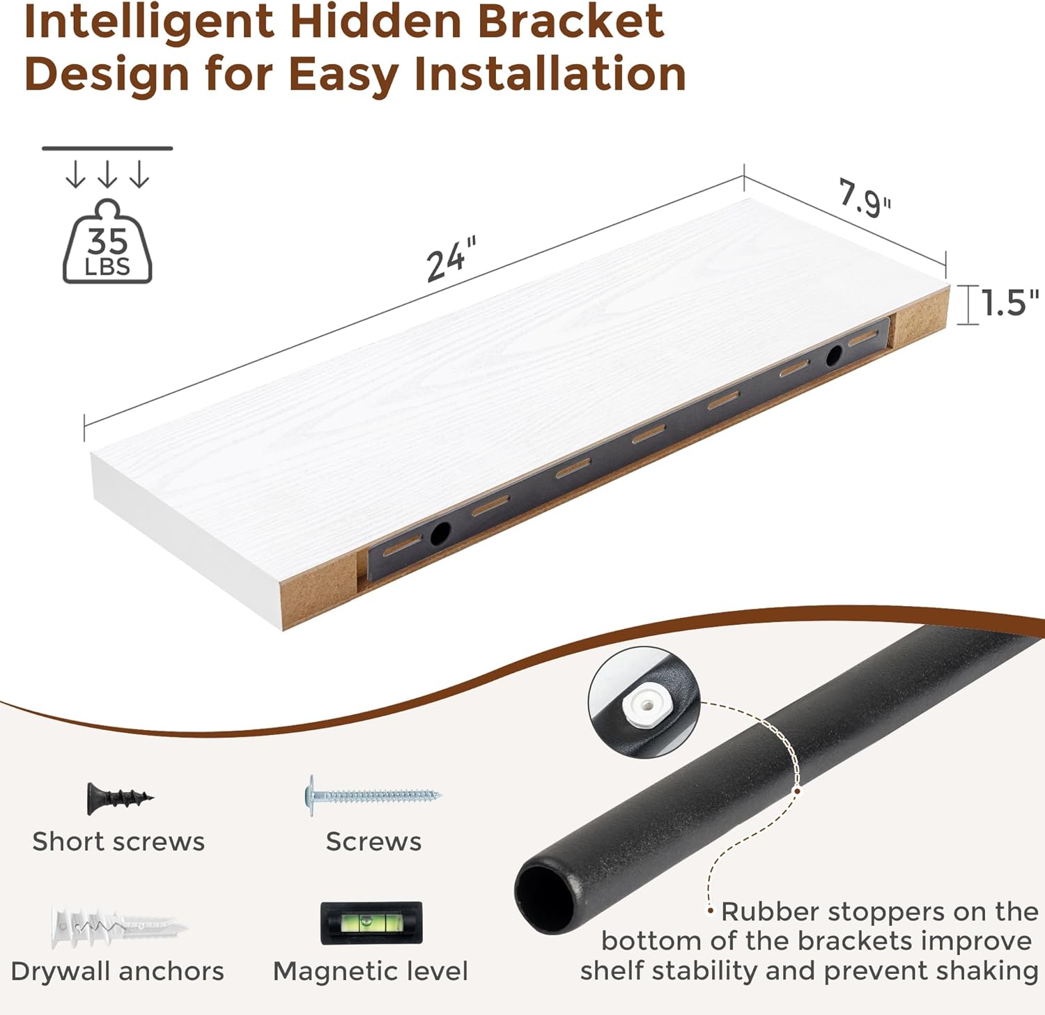 - ăEasy To InstallăThis white floating shelves not only come with stainless-steel galvanized invisible brackets, but also equipped a fixing screw at the bottom to fix the shelf on the support rod, which solves the problem of sliding and is not easy to damage, and can be used for a long time. Instructions, magnetic level, drywall anchors, and screws included.