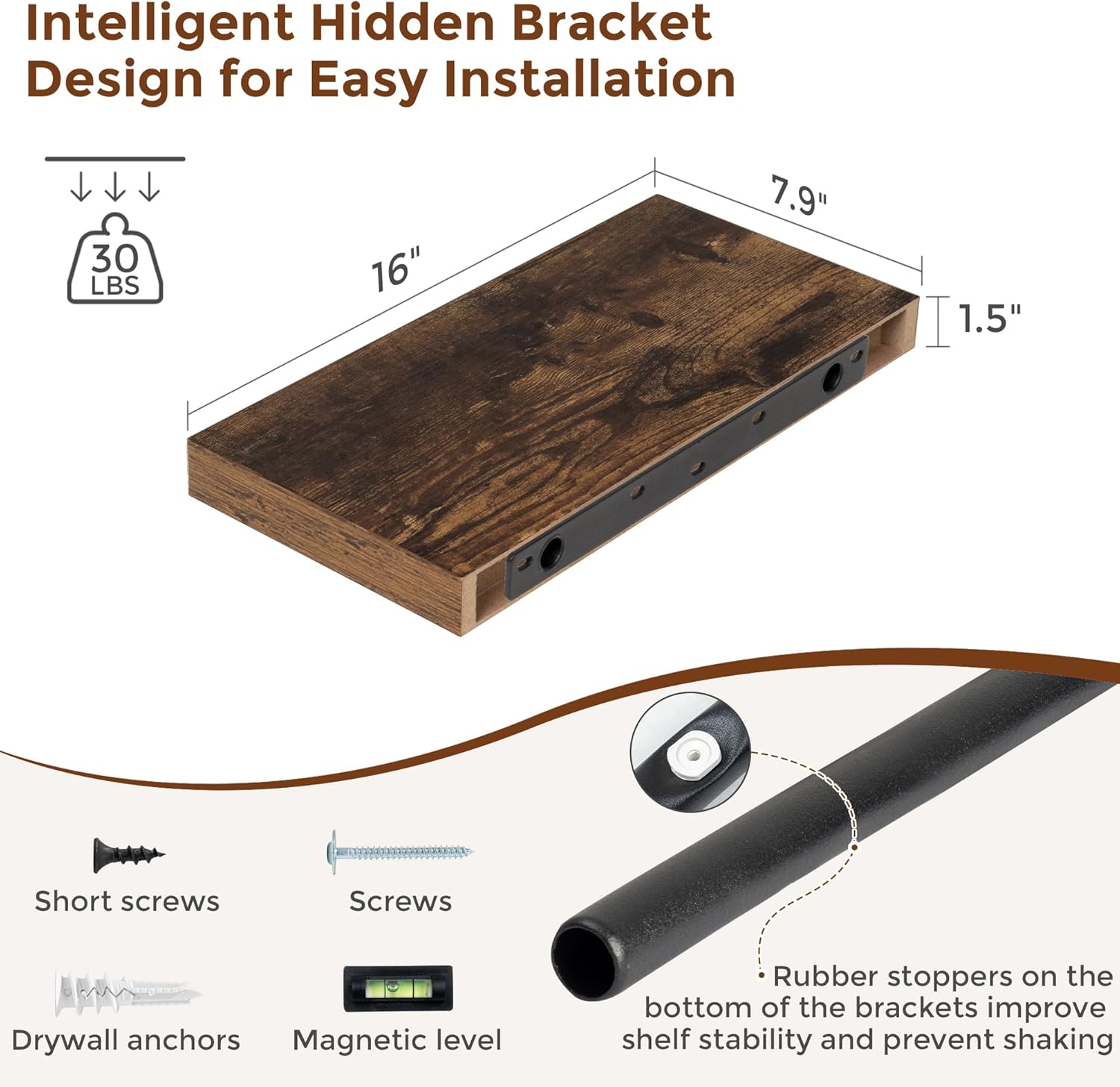 - ăEasy To InstallăThis rustic brown floating shelves not only come with stainless-steel galvanized invisible brackets, but also equipped a fixing screw at the bottom to fix the shelf on the support rod, which solves the problem of sliding and is not easy to damage, and can be used for a long time. Instructions, magnetic level, drywall anchors, and screws included.