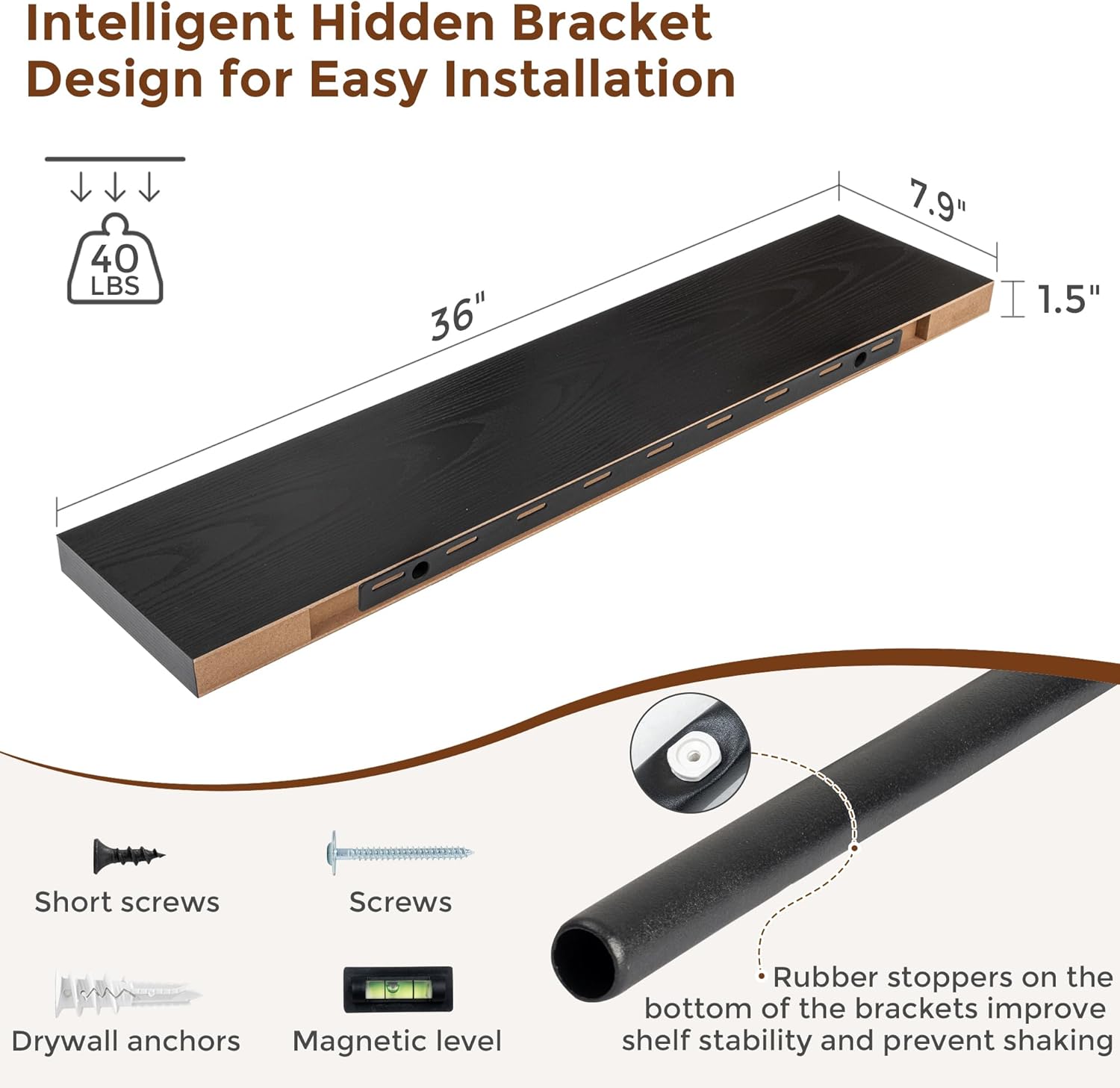 - ăEasy To InstallăThis black floating shelves not only come with stainless-steel galvanized invisible brackets, but also equipped a fixing screw at the bottom to fix the shelf on the support rod, which solves the problem of sliding and is not easy to damage, and can be used for a long time. Instructions, magnetic level, drywall anchors, and screws included.