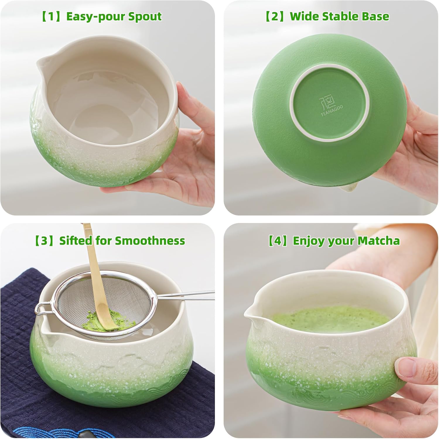 - 7-PCS MATCHA WHISK SET GREEN: 1*Ceramic Bowl (chawan) 560 Ml/18.9 Oz, 1*Bamboo Whisk, 1*Bamboo Scoop (chashaku), 1*Cermaic Whisk Holder, 1*Ceramic Scoop Stand, 1*Cotton Tea Cloth (chakin), 1*Matcha Powder Sifter.includes All Accessories