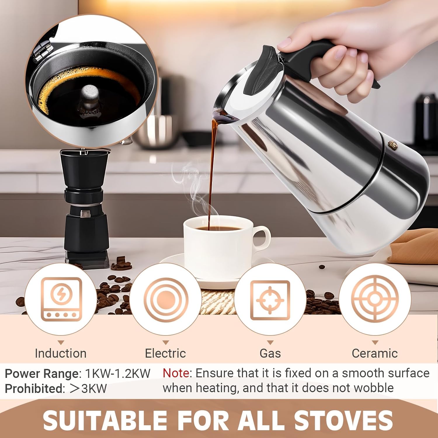 - COMPATIBLE WITH ALL HEAT SOURCES: Our stovetop coffee maker functions well on gas, induction, ceramic cooktops, or over an open flame. It’s ready for your every adventure