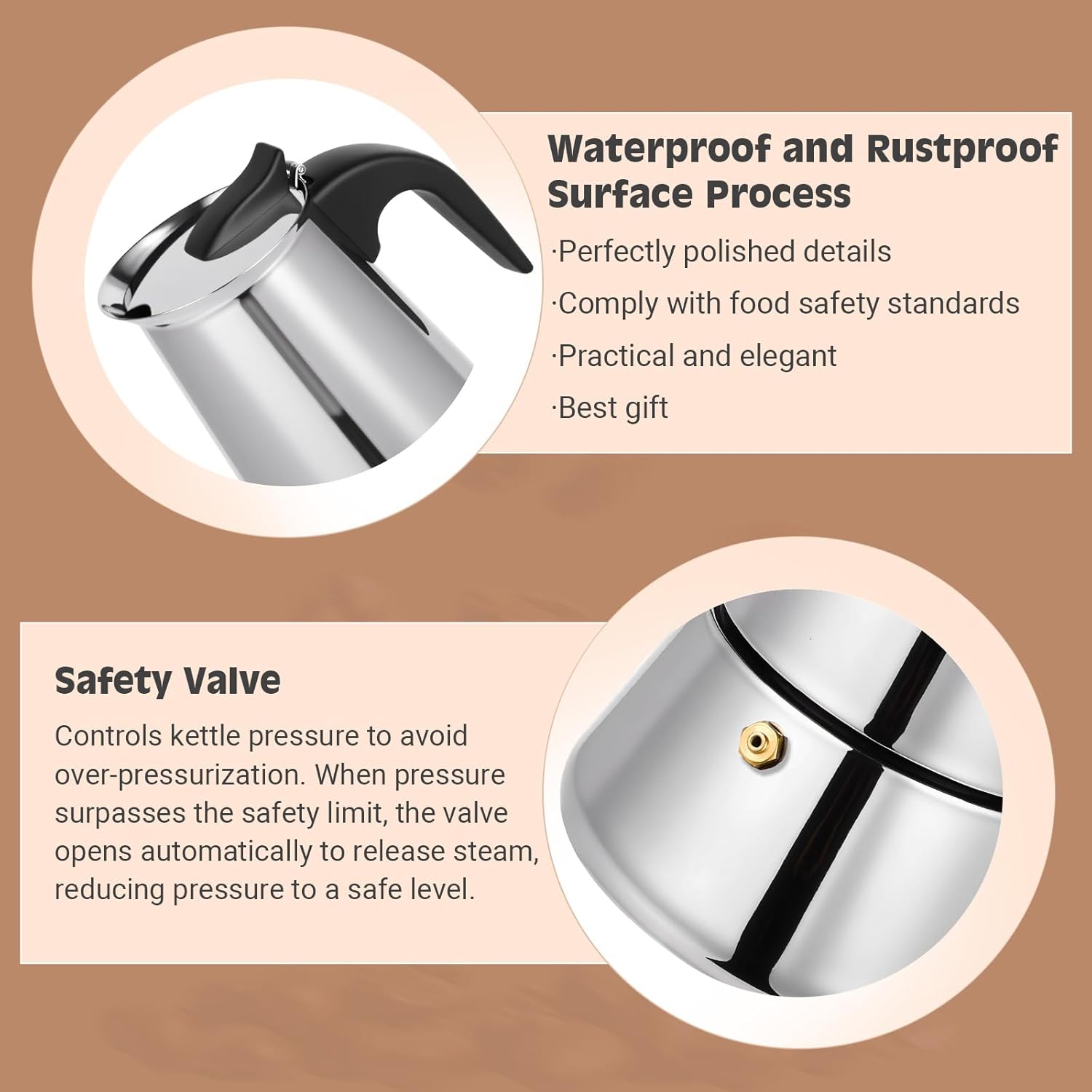 - HIGH-QUALITY 304 STAINLESS STEEL: Made of food-safe 304 stainless steel, compliant with EN13248. Our mocha pot resists coffee acids/scratches, retaining shine. The inner wall of the lower pot is sandblasted. Comes in gift-ready packaging
