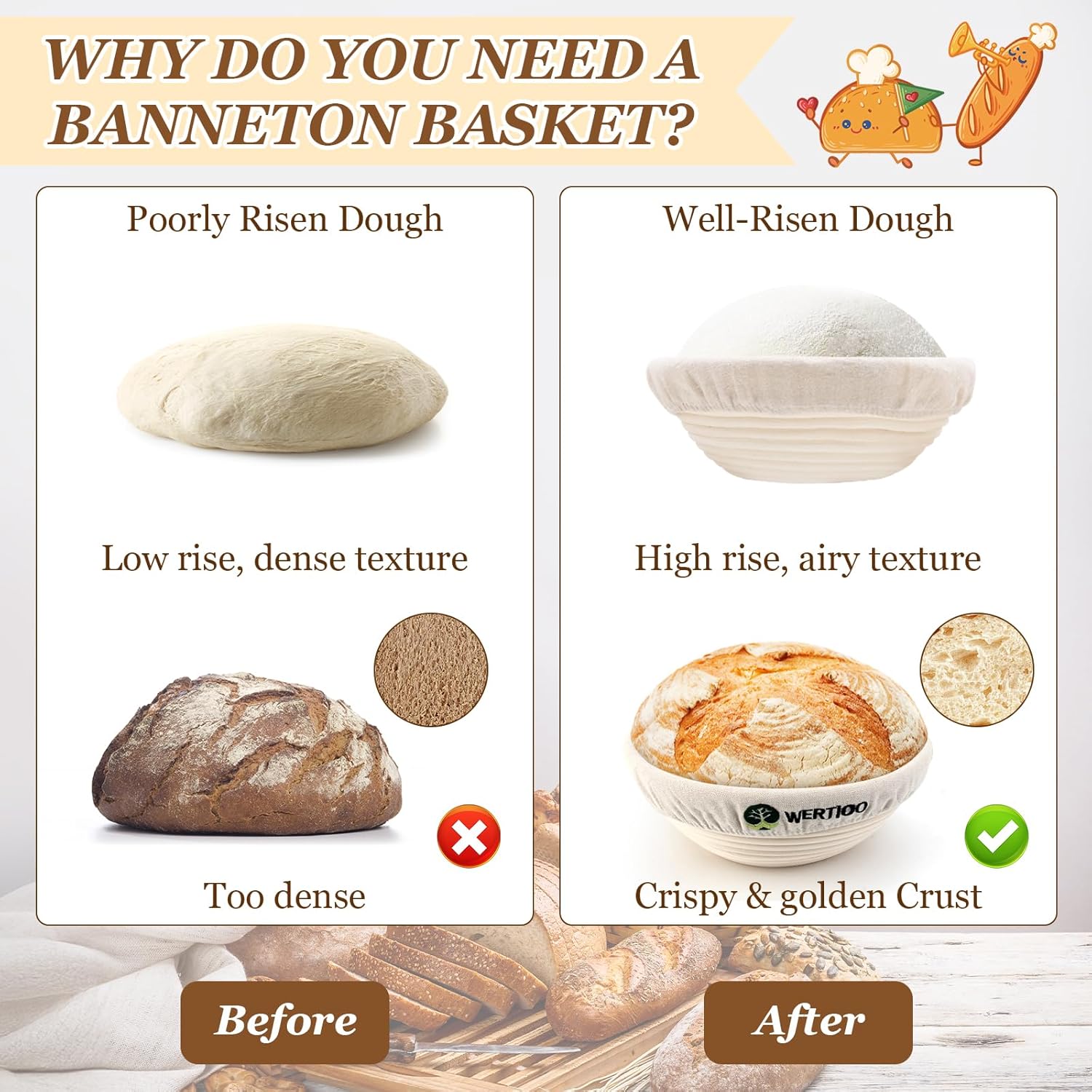 - What You Get: 9 inch round & 10 inch oval sourdough proofing basket, 1 sourdough starter jar, 1 cup cover, 1 breathable cloth cover, 1 feeding tracker band, 1 thermometer, 1 silicone spatula, 1 snap 2 liners, 1 bread lame and 5 blades, 1 bowl scraper, 1 danish dough dhisk, 1 cup brush, 1 bread recipes