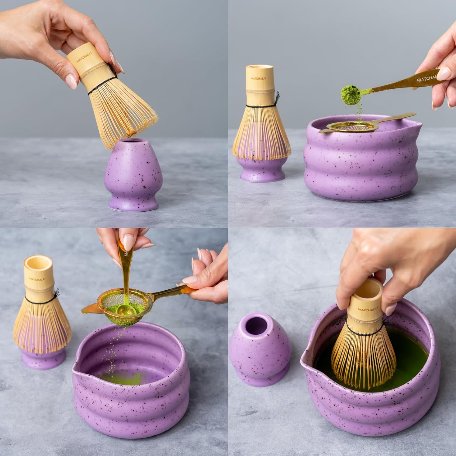 Premium 9 Piece Matcha Set Includes Ceramic Matcha Bowl, Bamboo Whisk & Holder, Stainless Steel Spoon & Sifter, Glass Cup & Straw, Electric Frother, Storage Bag - Gift for Matcha Lovers (Purple)
