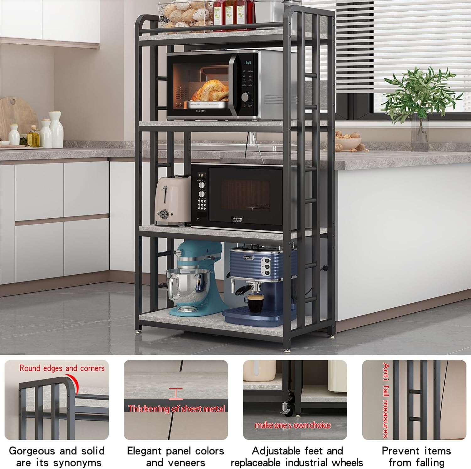 Adjustable 4-Tier Heavy Duty Kitchen Baker's Rack with Power Outlet, with Industrial Wheels, Free Standing Microwave Oven Cart Stand for Storage in Living Room, Garage, Greige