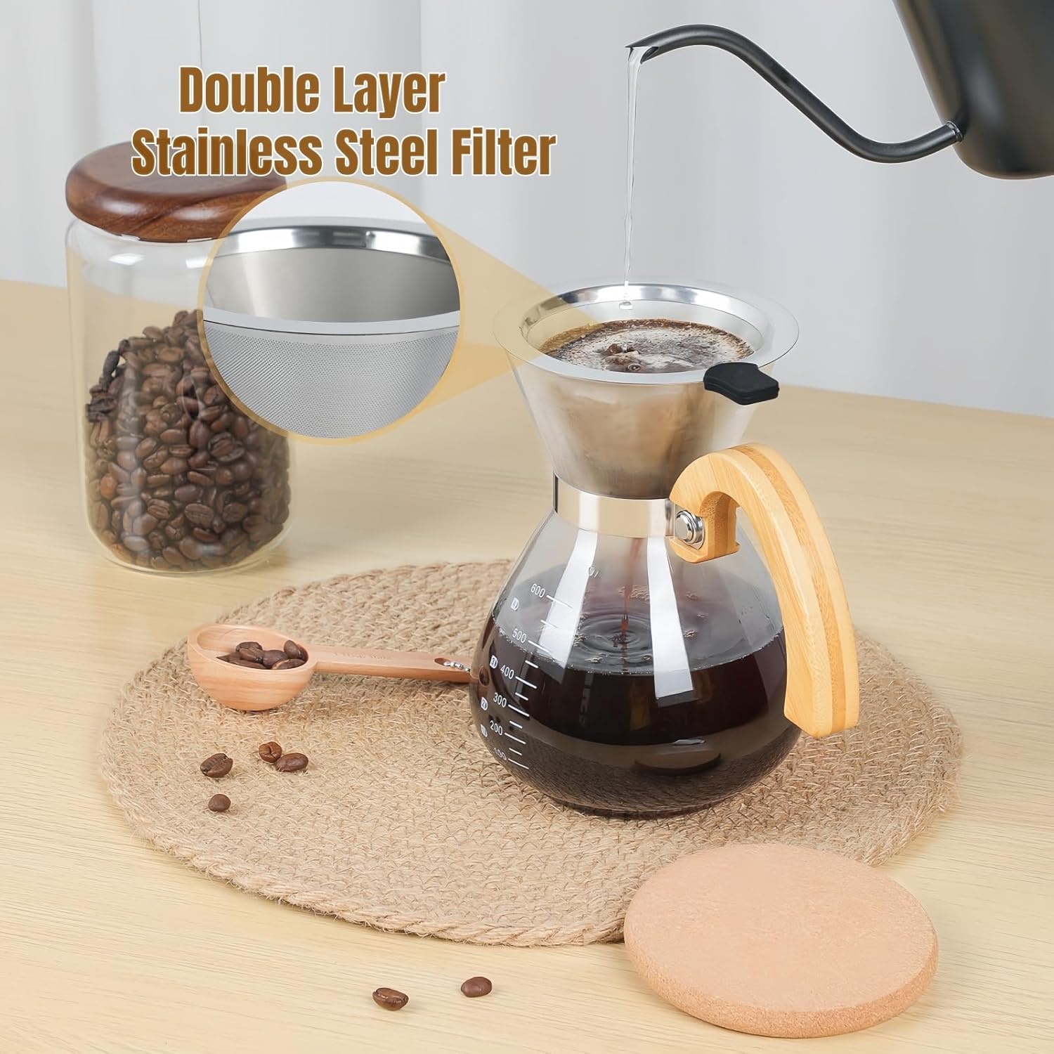 Pour Over Coffee Maker Set, with Double-Layer Stainless Filter and Wooden Handle, 20 oz 600ml Thickened Borosilicate Glass Pour Over Coffee Dripper for Home Café